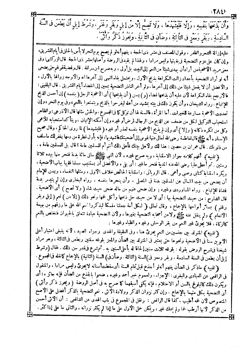 تنبيه المتولد بين جنسين من النعم يجزىء هنا وفي العقيقة والهدي وجزاء الصيد لأنه ينبغي اعتبار أعلى الأبوين سنا في الأضحية ونحوها حتى يعتبر في المتولد بين الضأن والمعز بلوغه سنتين ويطعن في الثالثة وهو مراد شيخنا في شرح الروض بقوله بلوغه ثلاث سنين إلحاقا له بأعلى السنين به