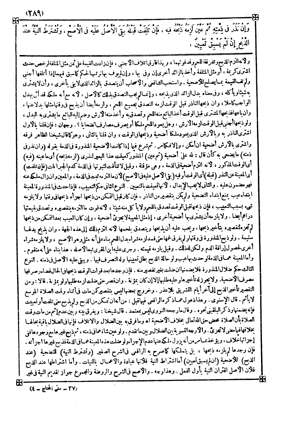 النوع الثالث حكم ضلال المنذورة فلا يضمنها إن ضلت بغير تقصير منه فإن وجدها بعد فوات الوقت ذبحها في الحال قضاء وصرفها مصرف الأضحية ولا يجوز له تأخيرها وعليه طلبها إلا إن كان بمؤنة وإن قصر حتى ضلت لزمه طلبها ولو بمؤنة