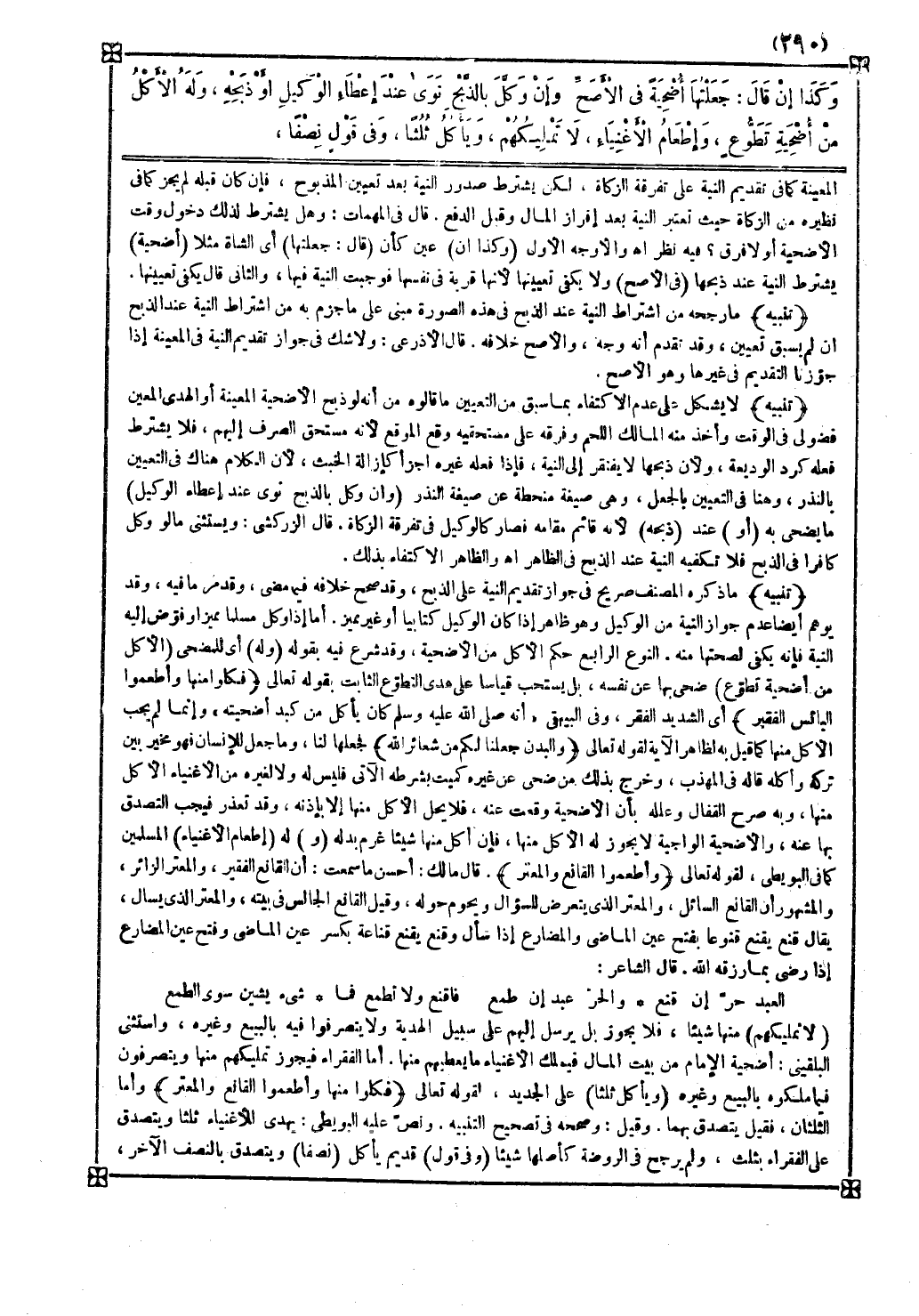 قال الشاعر العبد حر إن قنع والحر عبد إن طمع فاقنع ولا تطمع فما شيء يشين سوى الطمع ( لا تمليكهم ) منها شيئا فلا يجوز بل يرسل إليهم على سبيل الهدية ولا يتصرفوا فيه بالبيع وغيره واستثنى البلقيني أضحية الإمام من بيت المال فيملك الأغنياء ما يعطيهم منها أما الفقراء فيجوز تمليكهم منها ويتصرفون فيما ملكوه بالبيع وغيره ( ويأكل ثلثا ) على الجديد لقوله تعالى { فكلوا منها وأطعموا القانع والمعتر } وأما الثلثان فقيل يتصدق بهما