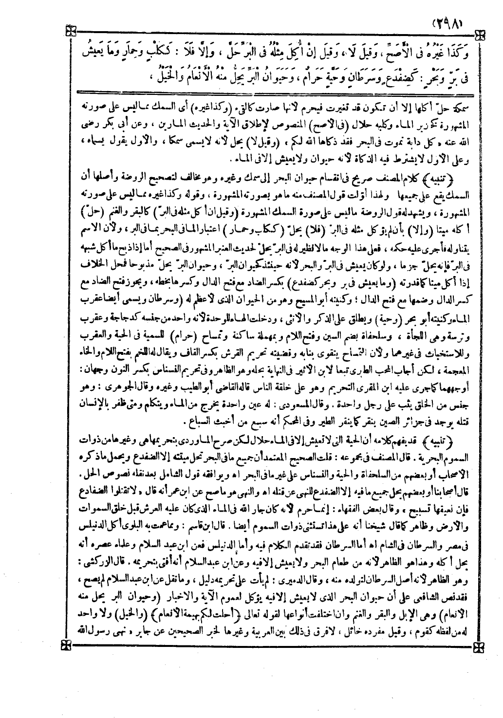 تنبيه كلام المصنف صريح في انقسام حيوان البحر إلى سمك وغيره وهو مخالف لتصحيح الروضة وأصلها أن السمك يقع على جميعها ولهذا أولت قول المصنف منه ما هو بصورته المشهورة وقوله وكذا غيره مما ليس على صورته المشهورة ويشهد له قول الروضة ما ليس على صورة السمك المشهورة