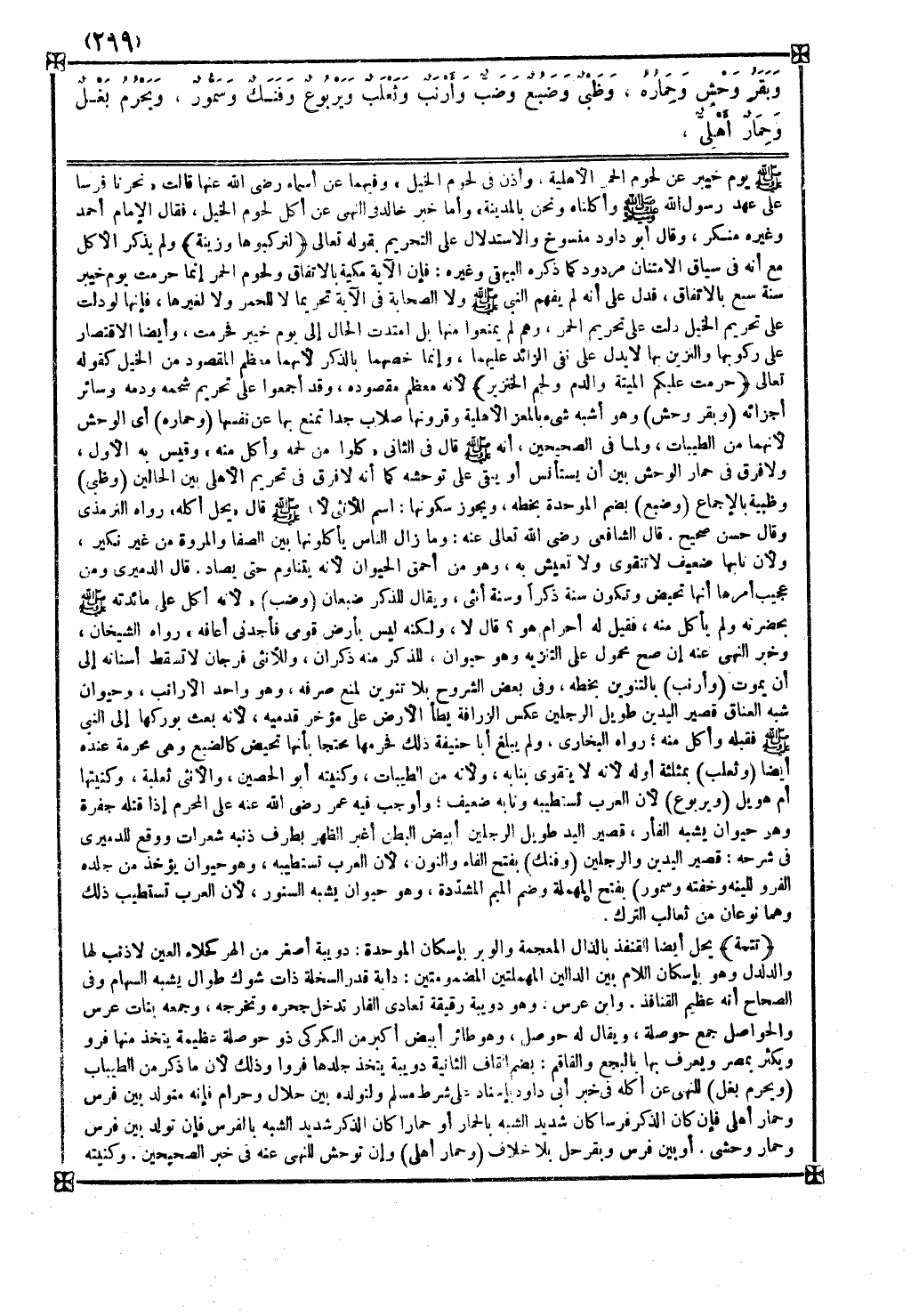 ( ويحرم بغل ) للنهي عن أكله في خبر أبي داود بإسناد على شرط مسلم ولتولده بين حلال وحرام فإنه متولد بين فرس وحمار أهلي فإن كان الذكر فرسا كان شديد الشبه بالحمار أو حمارا كان الذكر شديد الشبه بالفرس فإن تولد بين فرس وحمار وحشي أو بين فرس وبقر حل بلا خلاف ( وحمار أهلي ) وإن توحش للنهي عنه في خبر الصحيحين