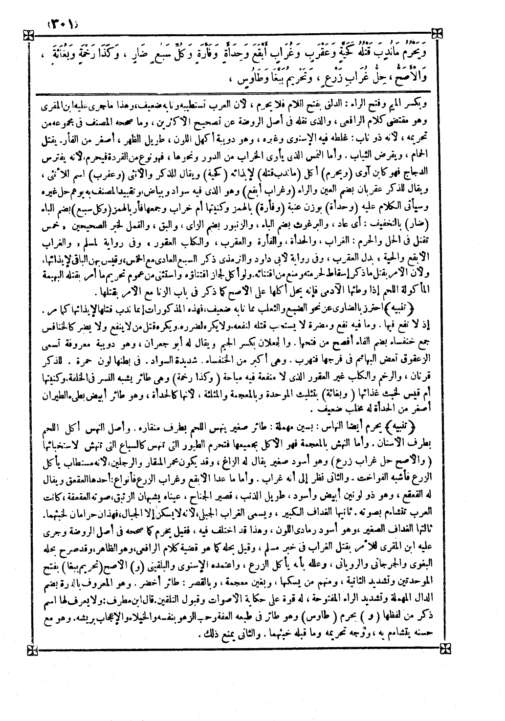 ثانيها الغداف الكبير ويسمى الغراب الجبلي لأنه لا يسكن إلا الجبال فهذان حرامان لخبثهما ثالثها الغداف الصغير وهو أسود رمادي اللون وهذا قد اختلف فيه فقيل يحرم كما صححه في أصل الروضة وجرى عليه ابن المقري للأمر بقتل الغراب في خبر مسلم وقيل بحله كما هو قضية كلام الرافعي وهو الظاهر وقد صرح بحله البغوي و الجرجاني و الروياني وعلله بأنه يأكل الزرع واعتمده الإسنوي و البلقيني