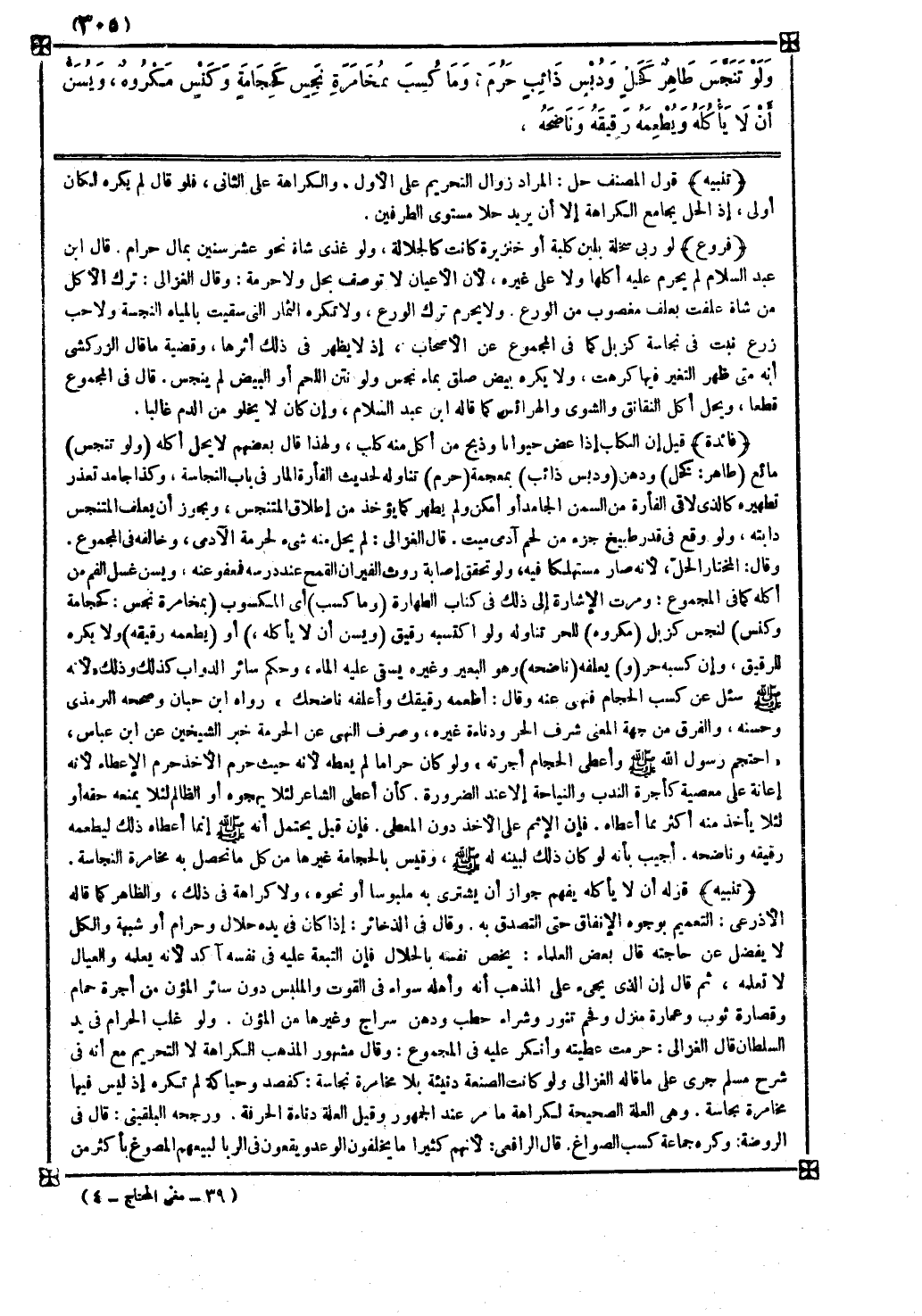وقال المختار الحل لأنه صار مستهلكا فيه ولو تحقق إصابة روث الفئران القمح عند درسه فمعفو عنه ويسن غسل الفم من أكله كما في المجموع ومرت الإشارة إلى ذلك في كتاب الطهارة ( وما كسب ) أي المكسوب ( بمخامرة نجس كحجامة وكنس ) لنجس كزبل ( مكروه ) للحر تناوله ولو اكتسبه رقيق ( ويسن أن لا يأكله ) أو ( يطعمه رقيقه ) ولا يكره للرقيق وإن كسبه حر ( و ) يعلفه ( ناضحه ) وهو البعير وغيره يسقى عليه الماء وحكم سائر الدواب كذلك وذلك لأنه صلى الله عليه وسلم سئل عن كسب الحجام فنهى عنه وقال أطعمه رقيقك وأعلفه ناضحك رواه ابن حبان وصححه الترمذي وحسنه والفرق من جهة المعنى شرف الحر ودناءة غيره وصرف النهي عن الحرمة خبر الشيخين عن ابن عباس احتجم رسول الله صلى الله عليه وسلم وأعطى الحجام أجرته ولو كان حراما لم يعطه لأنه حيث حرم الأخذ حرم الإعطاء لأنه إعانة على معصية كأجرة الندب والنياحة إلا عند الضرورة كأن أعطى الشاعر لئلا يهجوه أو الظالم لئلا يمنعه حقه أو لئلا يأخذ منه أكثر مما أعطاه فإن الإثم على الأخذ دون المعطى