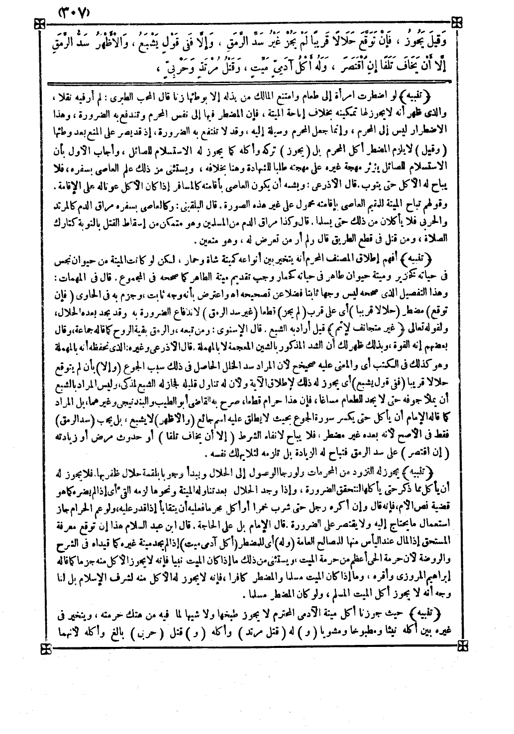 تنبيه حيث جوزنا أكل ميتة الآدمي المحترم لا يجوز طبخها ولا شيها لما فيه من هتك حرمته ويتخير في غيره بين أكله نيئا ومطبوخا ومشويا