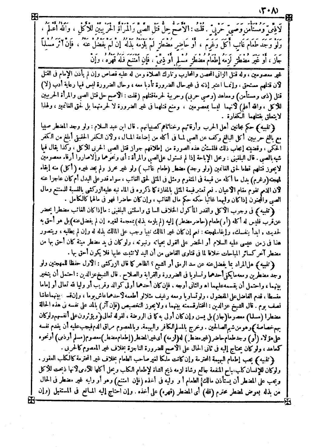 معصومين وله قتل الزاني المحصن والمحارب وتارك الصلاة ومن له عليه قصاص وإن لم يأذن الإمام في القتل لأن قتلهم مستحق وإنما اعتبر إذنه في غير حال الضرورة تأدبا معه وحال الضرورة ليس فيها رعاية أدب ( لا ) قتل ( ذمي ومستأمن ) معاهد ( وصبي حربي ) وحربية لحرمة قتلهم ( قلت الأصح حل قتل الصبي والمرأة الحربيين للأكل والله أعلم ) لأنهما ليسا بمعصومين ومنع قتلهما في غير الضرورة لا لحرمتهما بل لحق الغانمين ولهذا لا يتعلق بقتلهما الكفارة