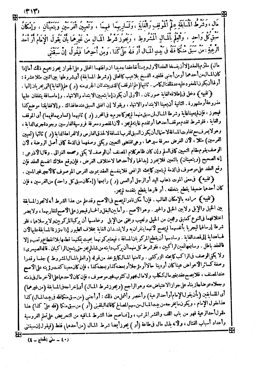 ملتزم بالعقد إلا أن يفسخا العقد الأول ويستأنفا عقدا جديدا إن وافقهما المحلل وعلى الجواز يجوز جميع ذلك أما إذا كان المال من أحدهما أو من أجنبي فلغيره الفسخ بلا عيب كالمحلل ( وشرط المسابقة ) أي شروطها بين اثنين مثلا عشرة أولها أن يكون المعقود عليه عدة للقتال كما مر ثانيها ( علم الموقف ) الذي يبتدئان الجري منه ( و ) علم ( الغاية ) التي يجريان إليها