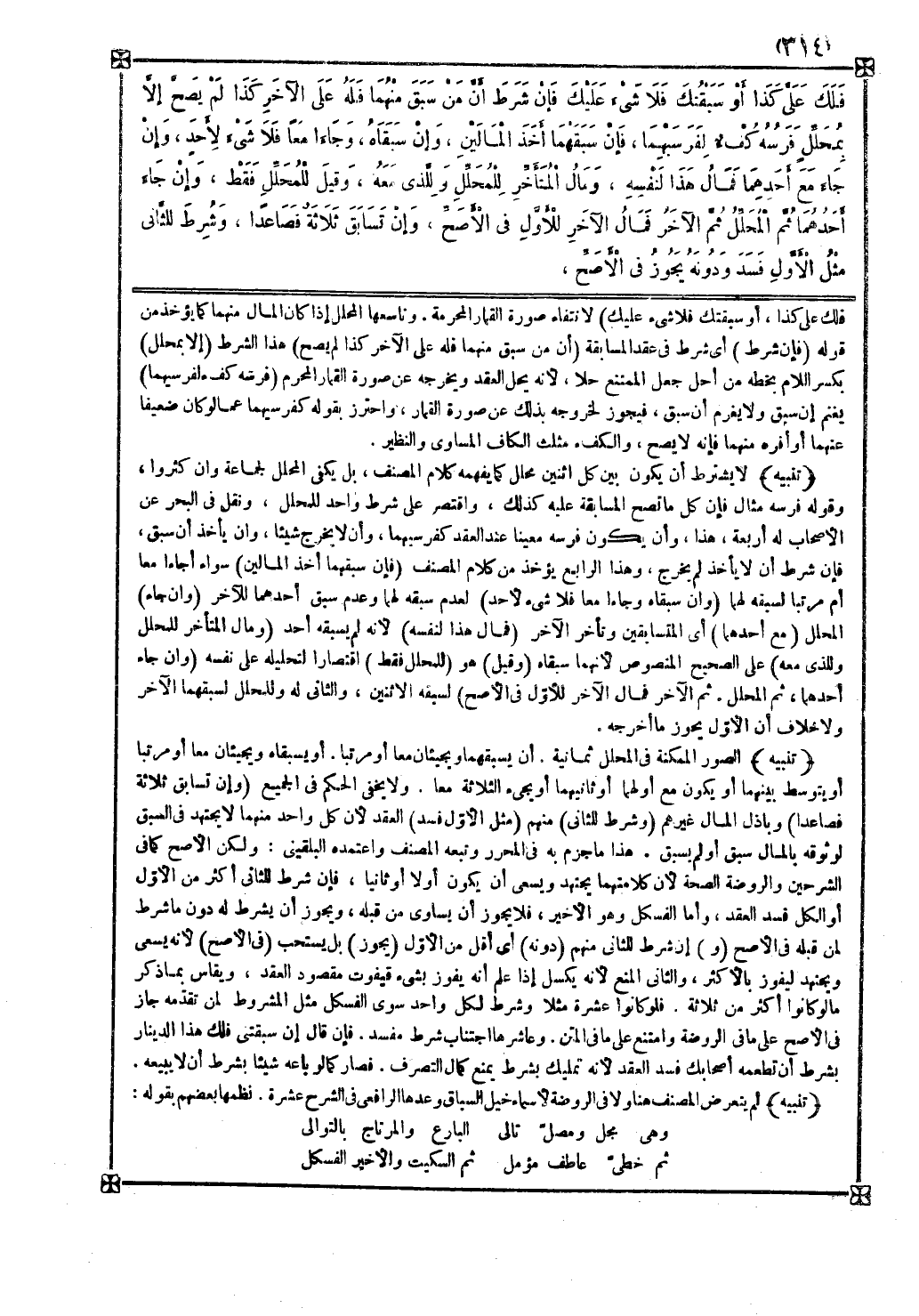 وتاسعها المحلل إذا كان المال منهما كما يؤخذ من قوله ( فإن شرط ) أي شرط في عقد المسابقة ( أن من سبق منهما فله على الآخر كذا لم يصح ) هذا الشرط ( إلا بمحلل ) بكسر اللام بخطه من أحل جعل الممتنع حلا لأنه يحل العقد ويخرجه عن صورة القمار المحرم ( فرسه كفء لفرسيهما ) يغنم إن سبق ولا يغرم أن سبق فيجوز لخروجه بذلك عن صورة القمار واحترز بقوله كفرسيهما عما لو كان ضعيفا عنهما أو أفره منهما فإنه لا يصح والكفء مثلث الكاف المساوي والنظير