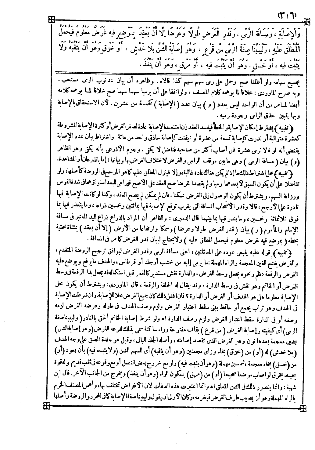 ( و ) بيان ( مسافة ارمي ) وهي ما بين موقف الرامي والغرض لاختلاف الغرض بها وبيانها إما بالذرعان أو المشاهدة