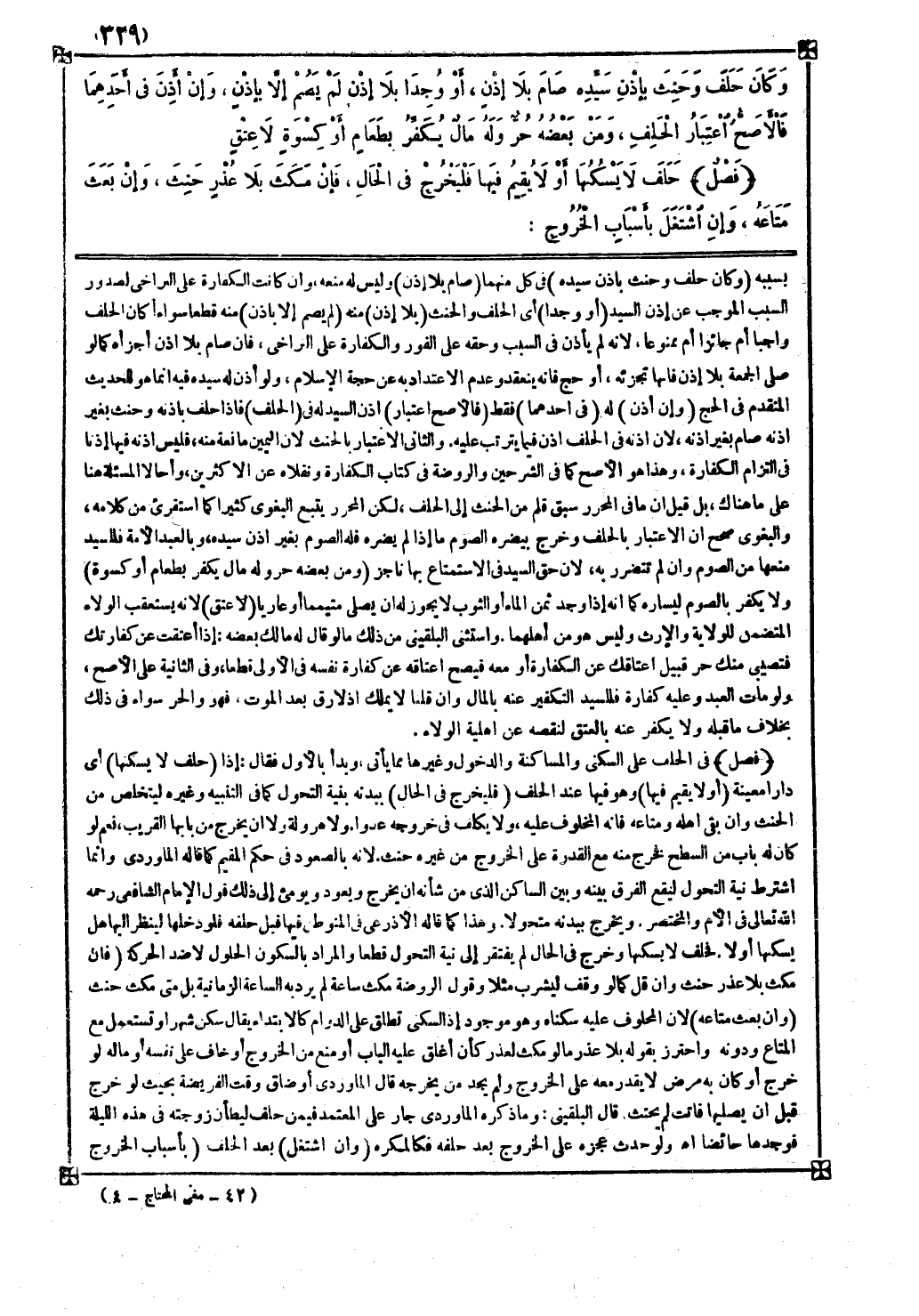 فصل في الحلف على السكنى والمساكنة والدخول وغيرها مما يأتي وبدأ بالأول فقال إذا ( حلف لا يسكنها ) أي دارا معينة ( أو لا يقيم فيها ) وهو فيها عند الحلف ( فليخرج في الحال ) ببدنه بنية التحول كما في التنبيه وغيره ليتخلص من الحنث وإن بقي أهله ومتاعه فإنه المخلوف عليه ولا يكلف في خروجه عدوا ولا هرولة ولا أن يخرج من بابها القريب نعم لو كان له باب من السطح فخرج منه مع القدرة على الخروج من غيره حنث لأنه بالصعود في حكم المقيم كما قاله الماوردي وإنما اشترط نية التحول ليقع الفرق بينه وبين الساكن الذي من شأنه أن يخرج ويعود ويومىء إلى ذلك قول الإمام الشافعي رحمه الله تعالى في الأم والمختصر ويخرج ببدنه متحولا