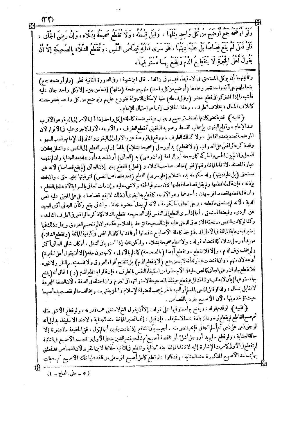 أما إذا سرى القطع إلى النفس فإن الصحيحة تقطع بالشلاء كما ذكره الرافعي في الطرف الثالث وكذا لو كانت النفس مستحقة الإزهاق للمجني عليه فإن الصحيحة تؤخذ بالشلاء وعكسه وإن لم تنحسم العروق ويطرد ذلك فيما يعتبر فيه رعاية المماثلة في الأطراف فتؤخذ كاملة الأصابع بناقصتها أو فاقدتها كما في الرافعي في كيفية المماثلة ( وتقطع الشلاء ) من يد أو رجل بشلاء كما اقتضاه قوله ولا تقطع صحيحة بشلاء ولكن محله إذا استويا في الشلل أو كان شلل الجاني أكثر ولم يخف نزف الدم وإلا فلا تقطع وتقطع أيضا ( بالصحيحة ) كما علم بالأولى لأنها دون حقه ( إلا أن يقول أهل الخبرة ) أي عدلان منهم وإن اقتضت عبارته أنه لا بد من جمع ( لا ينقطع الدم ) بل تنفتح أفواه العروق ولا تنسد بحسم النار ولا غيره فلا تقطع بها وإن رضي الجاني كما نص عليه في الأم حذرا من استيفاء النفس بالطرف فإن قالوا ينقطع الدم ( و ) الحال أنه ( يقنع بها مستوفيها ) بأن لا يطلب أرشا للشلل فيقطع حينئذ بالصحيحة لاستوائهما في الجرم وإن اختلفا في الصفة لأن الصفة المجردة لا تقابل بمال ولذا لو قتل الذمي بالمسلم أو العبد بالحر لم يجب لفضيلة الإسلام والحرية شيء ويخالف ما لو نقصت يده أصبعا حيث تؤخذ ديتها لأن الأصبع تفرد بالقصاص