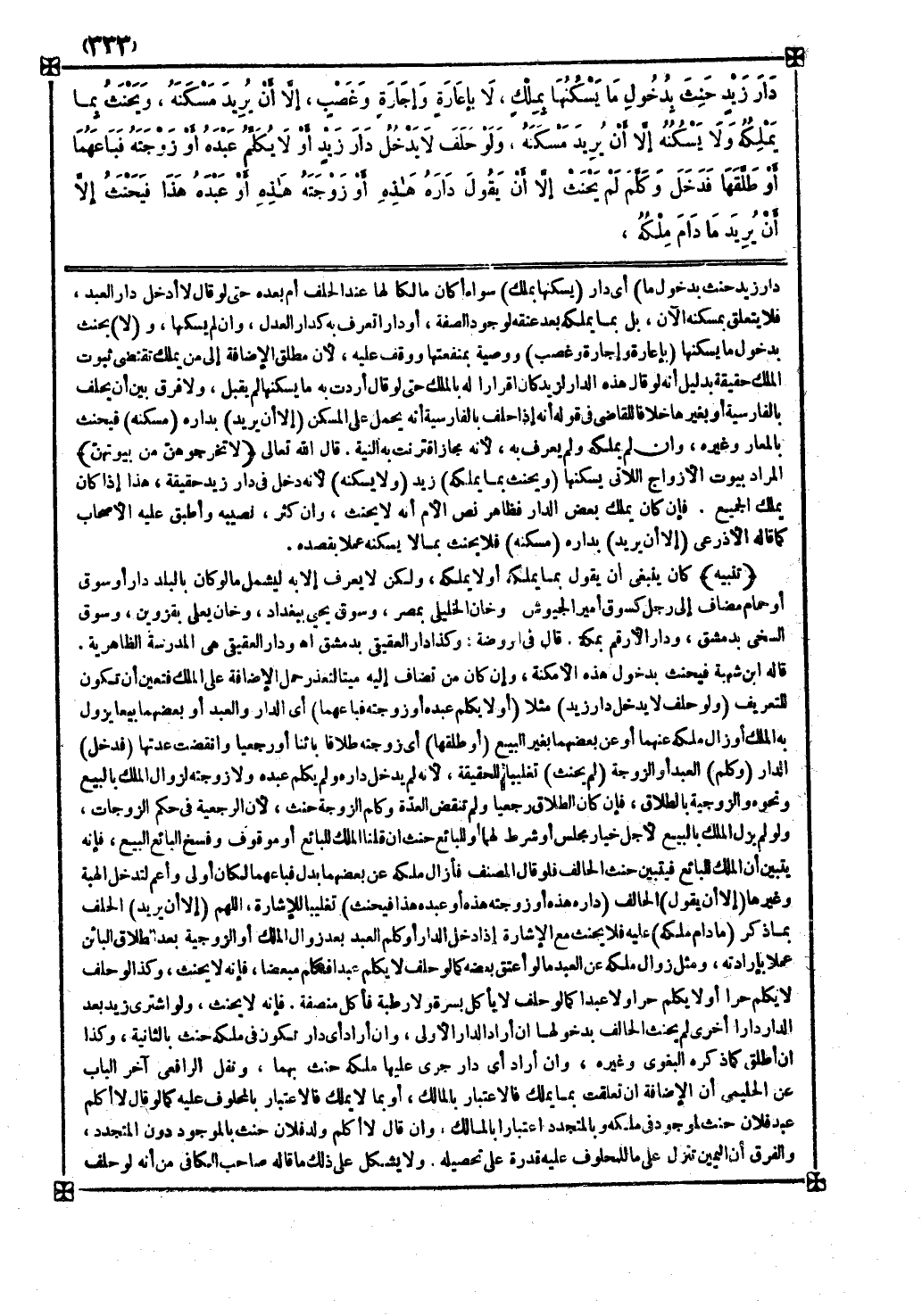 دار زيد حنث بدخول ما ) أي دار ( يسكنها بملك ) سواء أكان مالكا لها عند الحلف أم بعده حتى لو قال لا أدخل دار العبد فلا يتعلق بمسكنه الآن بل ما يملكه بعد عتقه لوجود الصفة أو دارا تعرف به كدار العدل وإن لم يسكنها و ( لا ) يحنث بدخول ما يسكنها ( بإعارة وإجارة وغصب ) ووصية بمنفعتها ووقف عليه لأن مطلق الإضافة إلى من يملك تقتضي ثبوت الملك حقيقة بدليل أنه لو قال هذه الدار لزيد كان إقرارا له بالملك حتى لو قال أردت به ما يسكنها لم يقبل ولا فرق بين أن يحلف بالفارسية أو بغيرها خلافا للقاضي في قوله أنه إذا حلف بالفارسية أنه يحمل على المسكن ( إلا أن يريد ) بداره ( مسكنه ) فيحنث بالمعار وغيره وإن لم يملكه ولم يعرف به لأنه مجاز اقترنت به النية