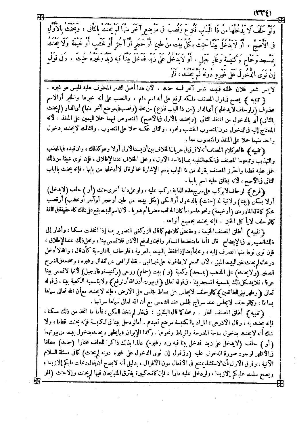 ( أو ) حلف ( لا يدخل على زيد فدخل بيتا فيه زيد وغيره ) عالما بذلك ذاكرا للحلف مختارا ( حنث ) مطلقا في الأظهر لوجود صورة الدخول عليه ( وفي قول إن نوى الدخول على غيره دونه لم يحنث ) كما في مسألة السلام الآتية وفرق الأول بأن الاستثناء يمتنع في الأفعال دون الأقوال بدليل أنه لا يصح أن يقال دخلت عليكم إلا زيدا ويصح سلمت عليكم إلا زيدا ولو دخل عليه دارا فإن كانت كبيرة يفترق المتبايعان فيها لم يحنث وإلا حنث ( فلو