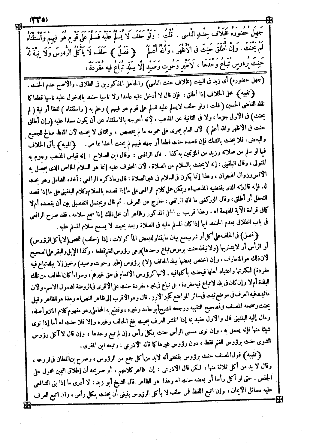فصل في الحلف على أكل أو شرب مع بيان ما يتناوله بعض المأكولات إذا ( حلف ) شخص ( لا يأكل الرؤوس ) أو الرأس أو لا يشتريها ( ولا نية له حنث برؤوس تباع وحدها ) وهي رؤوس الغنم قطعا وكذا الإبل والبقر على الصحيح لأن ذلك هو المتعارف وإن اختص بعضها ببلد الحالف ( لا ) برؤوس ( طير وحوت وصيد ) وخيل ( إلا ببلد تباع فيه مفردة ) لكثرتها واعتياد أهلها فيحنث بأكلها فيه لأنه كرؤوس الأنعام في حق غيرهم وسواء أكان الحالف من تلك البلدة أم لا وإن كان في بلد لا تباع فيه مفردة بل تباع في غيره مفردة حنث على الأقوى في الروضة لشمول الاسم ولأن ما ثبت فيه العرف في موضع ثبت في سائر المواضع كخبز الأرز