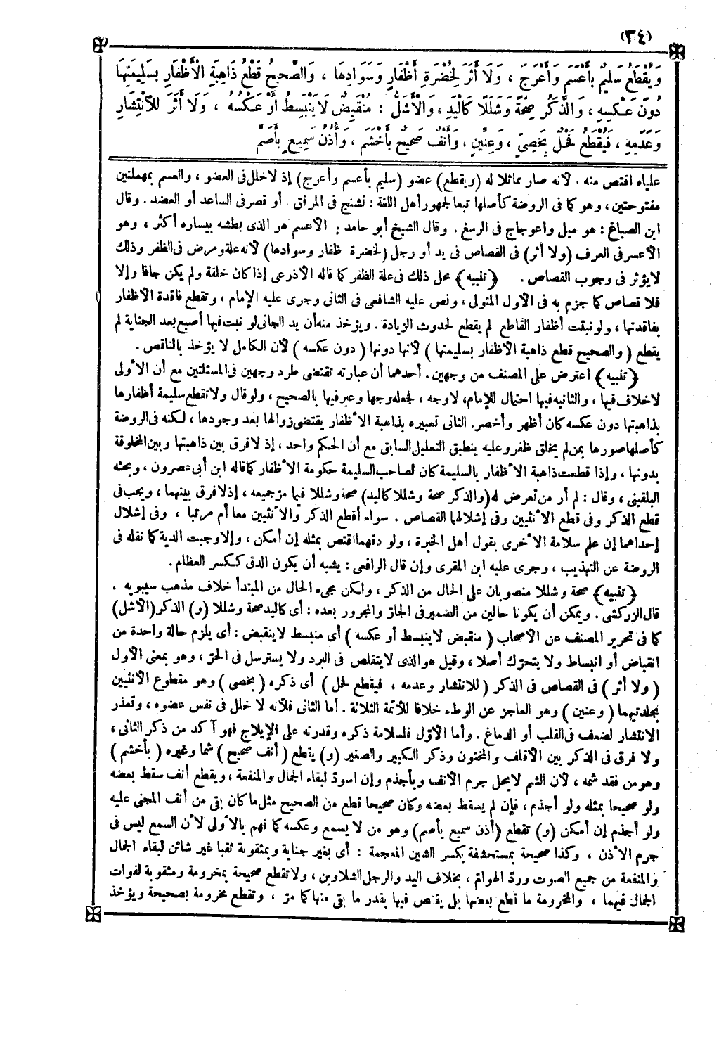 تنبيه محل ذلك في علة الظفر كما قاله الأذرعي إذا كان خلقة ولم يكن جافا وإلا فلا قصاص كما جزم به في الأول المتولي ونص عليه الشافعي في الثاني وجرى عليه الإمام وتقطع فاقدة الأظفار بفاقدتها ولو نبتت أظفار القاطع لم يقطع لحدوث الزيادة