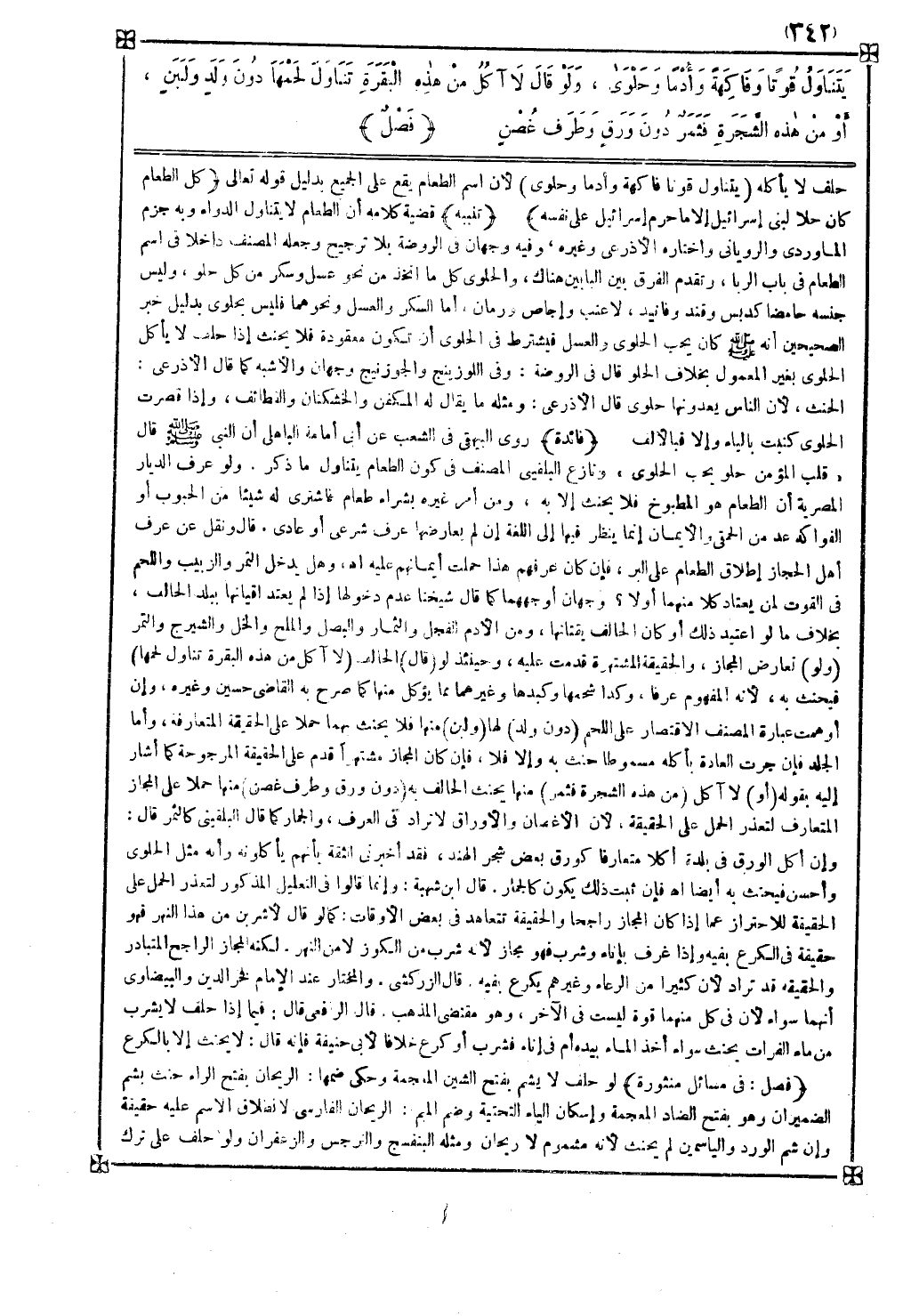 تنبيه قضية كلامه أن الطعام لا يتناول الدواء وبه جزم الماوردي و الروياني واختاره الأذرعي وغيره وفيه وجهان في الروضة بلا ترجيح وجعله المصنف داخلا في اسم الطعام في باب الربا وتقدم الفرق بين البابين هناك والحلوى كل ما اتخذ من نحو عسل وسكر من كل حلو وليس جنسه حامضا كدبس وقند وفانيد لا عنب وإجاص ورمان أما السكر والعسل ونحوهما فليس بحلوى بدليل خبر الصحيحين أنه صلى الله عليه وسلم كان يحب الحلوى والعسل فيشترط في الحلوى أن تكون معقودة فلا يحنث إذا حلف لا يأكل الحلوى بغير المعمول بخلاف الحلو