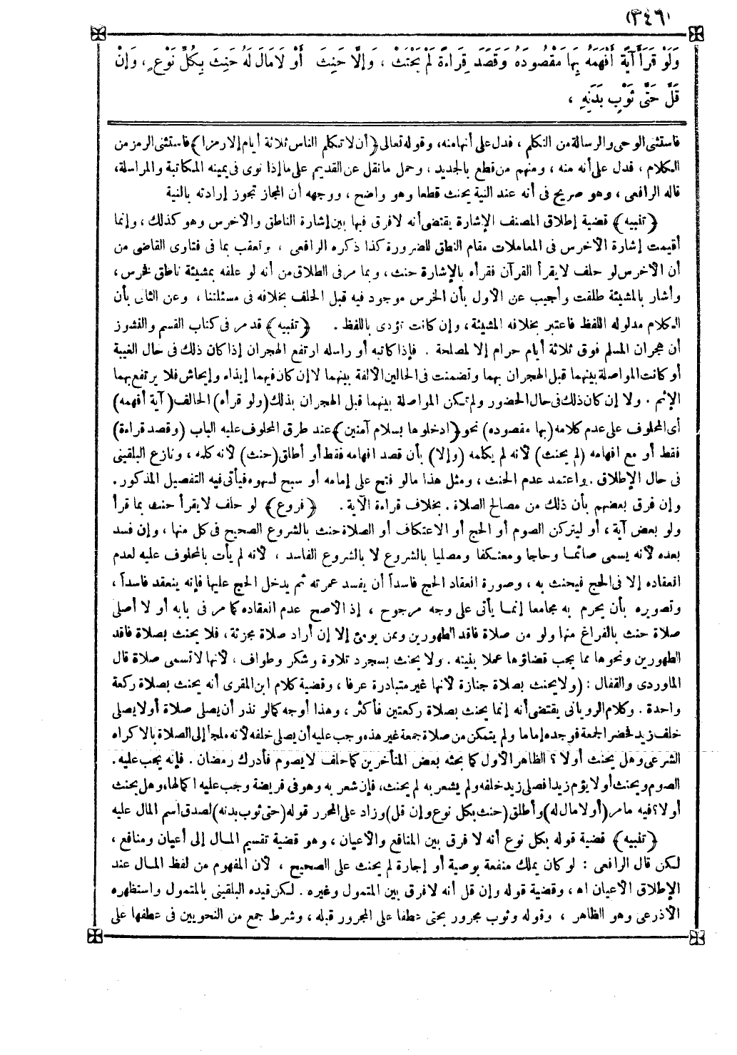 ( ولو قرأه ) الحالف ( آية أفهمه ) أي المحلوف على عدم كلامه ( بها مقصوده ) نحو { ادخلوها بسلام آمنين } عند طرق المحلوف عليه الباب ( وقصد قراءة ) فقط أو مع إفهامه ( لم يحنث ) لأنه لم يكلمه ( وإلا ) بأن قصد إفهامه فقط أو أطلق ( حنث ) لأنه كلمه ونازع البلقيني في حال الإطلاق