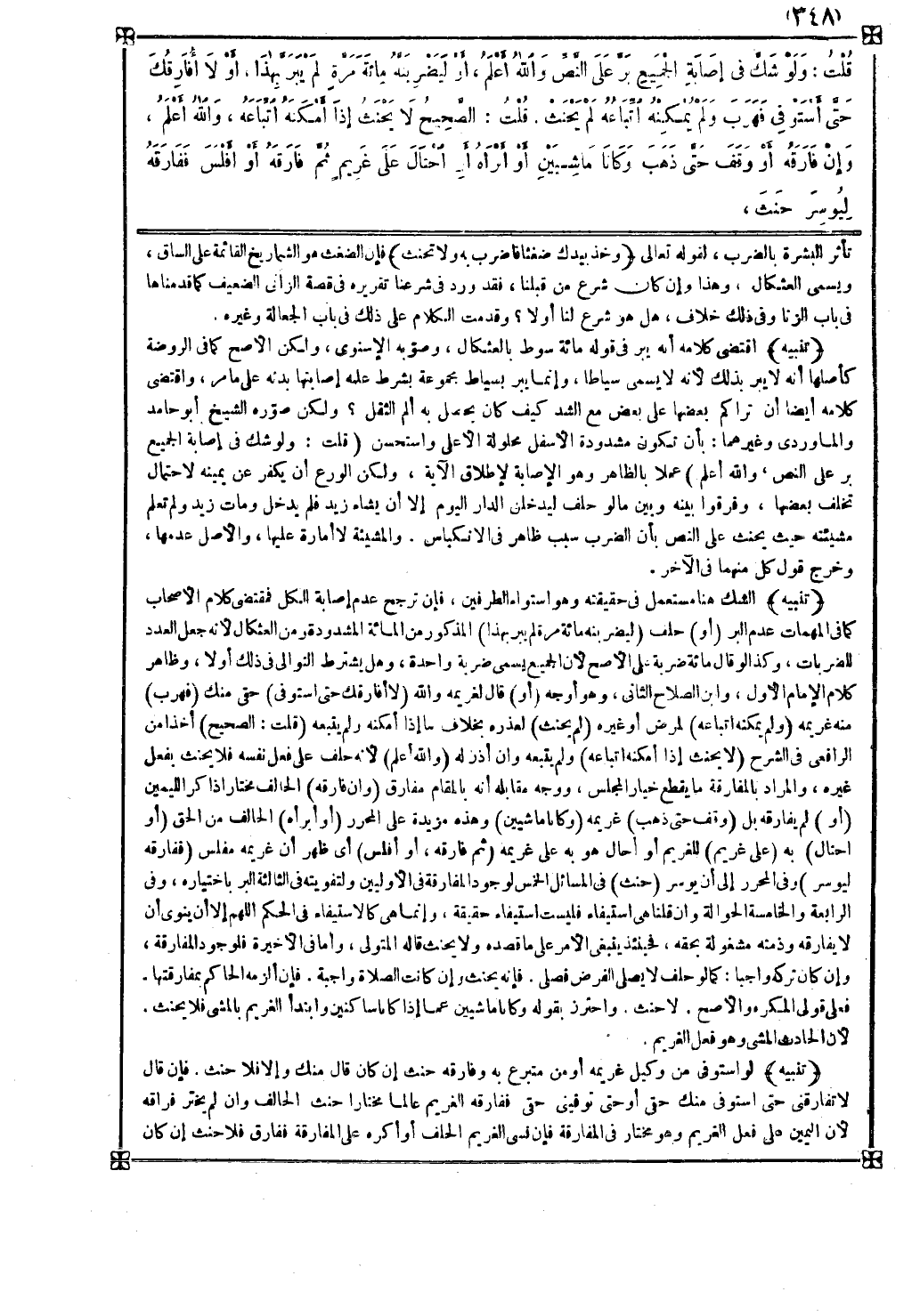 ( أو ) حلف ( ليضربنه مائة مرة لم يبر بهذا ) المذكور من المائة المشدودة ومن العثكال لأنه جعل العدد للضربات وكذا لو قال مائة ضربة على الأصح لأن الجميع يسمى ضربة واحدة وهل يشترط التوالي في ذلك أو لا وظاهر كلام الإمام الأول وابن الصلاح الثاني وهو أوجه ( أو ) قال لغريمه والله ( لا أفارقك حتى استوفي ) حقي منك ( فهرب ) منه غريمه ( ولم يمكنه اتباعه ) لمرض أو غيره ( لم يحنث ) لعذره بخلاف ما إذا أمكنه ولم يتبعه ( قلت الصحيح ) أخذا من الرافعي في الشرح ( لا يحنث إذا أمكنه اتباعه ) ولم يتبعه وإن أذن له ( والله أعلم ) لأنه حلف على فعل نفسه فلا يحنث بفعل غيره والمراد بالمفارقة ما يقطع خيار المجلس ووجه مقابله أنه بالمقام مفارق ( وإن فارقه ) الحالف مختارا ذاكرا لليمين ( أو ) لم يفارقه بل ( وقف حتى ذهب ) غريمه ( وكانا ماشيين ) وهذه مزيدة على المحرر ( أو أبرأه ) الحالف من الحق ( أو احتال ) به ( على غريم ) للغريم أو أحال هو به على غريمه ( ثم فارقه أو أفلس ) أي ظهر أن غريمه مفلس ( ففارقه ليوسر ) وفي المحرر إلى أن يوسر ( حنث ) في المسائل الخمس لوجود المفارقة في الأوليين ولتفويته في الثالثة البر باختياره وفي الرابعة والخامسة الحوالة