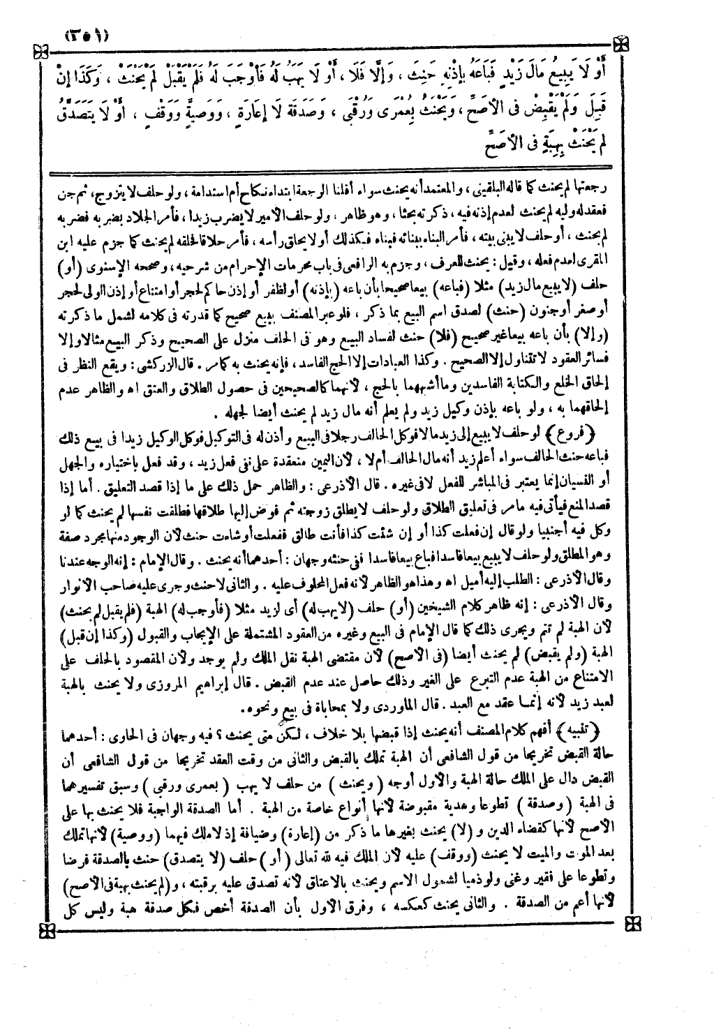 ( أو ) حلف ( لا يبيع مال زيد ) مثلا ( فباعه ) بيعا صحيحا بأن باعه ( بإذنه ) أو لظفر أو إذن حاكم لحجر أو امتناع أو إذن الولي لحجر أو صغر أو جنون ( حنث ) لصدق اسم البيع بما ذكر فلو عبر المصنف ببيع صحيح كما قدرته في كلامه لشمل ما ذكرته ( وإلا ) بأن باعه بيعا غير صحيح ( فلا ) حنث لفساد البيع وهو في الحلف منزل على الصحيح وذكر البيع مثالا وإلا فسائر العقود لا تتناول إلا الصحيح وكذا العبادات إلا الحج الفاسد فإنه يحنث به كما مر