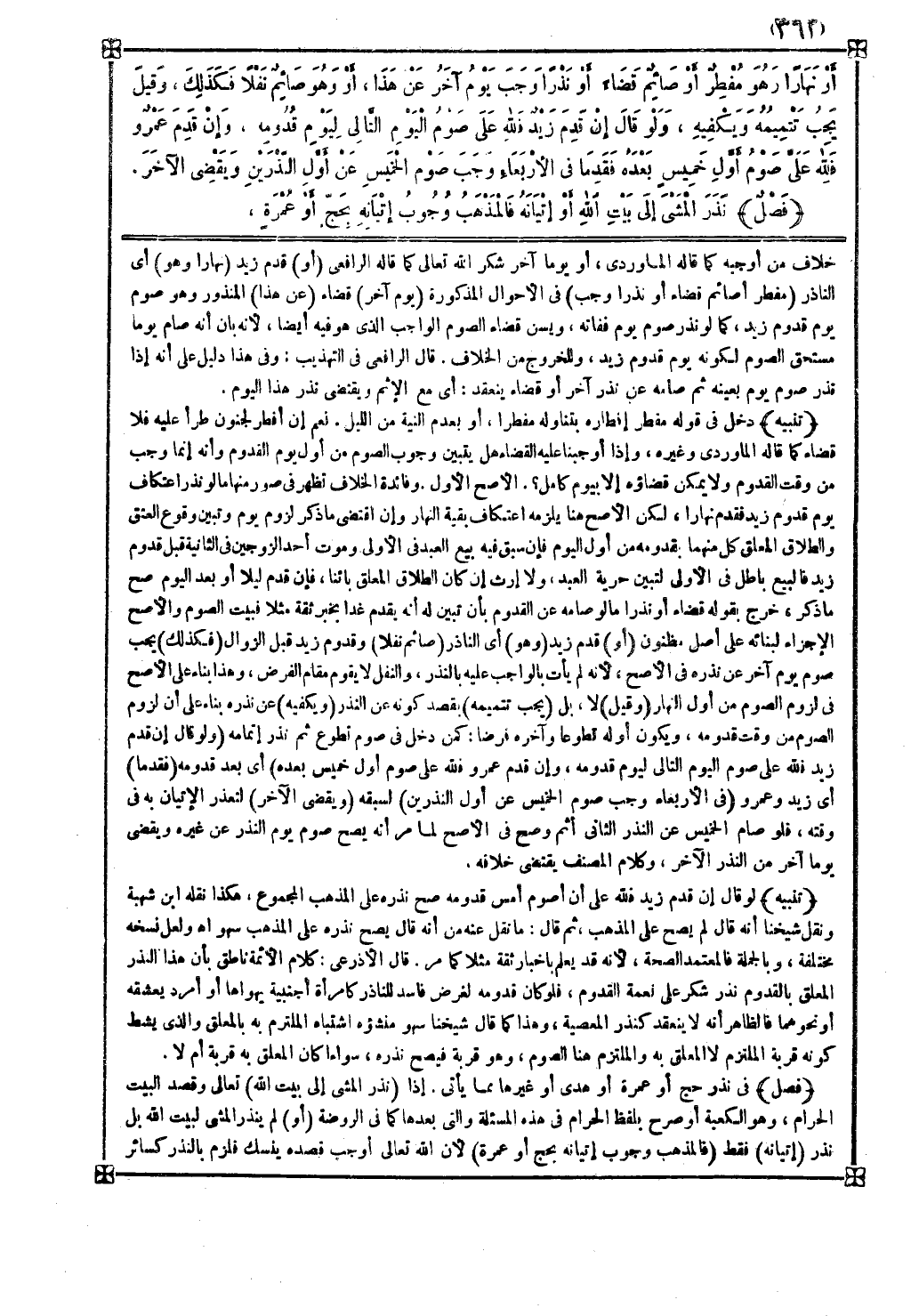 إذا ( نذر المشي إلى بيت الله ) تعالى وقصد البيت الحرام وهو الكعبة أو صرح بلفظ الحرام في هذه المسألة والتي بعدها كما في الروضة ( أو ) لم ينذر المشي لبيت الله بل نذر ( إتيانه ) فقط ( فالمذهب وجوب إتيانه بحج أو عمرة ) لأن الله تعالى أوجب قصده بنسك فلزم بالنذر كسائر