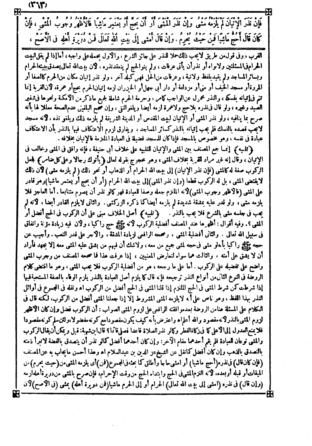 والثاني أفضلية المشي وصححه الرافعي لزيادة المشقة والأجر على قدر التعب وأجيب عن حجه صلى الله عليه وسلم راكبا بأنه لو مشى في حجه لمشى جميع من معه ولا شك أن فيهم من يشق عليه المشي معه إلا بجهد فأراد أن لا يشق على أمته