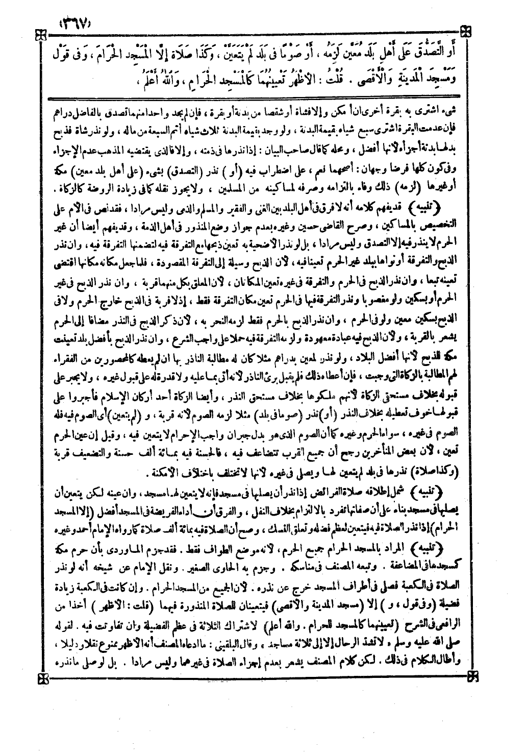تنبيه شمل إطلاقه صلاة الفرائض إذا نذر أن يصليها في مسجد فإنه لا يتعين لها مسجد وإن عينه لكن يتعين أن يصليها في مسجد بناء على أن صفاتها تفرد بالالتزام بخلاف النفل والفرق أن أداء الفريضة في المسجد أفضل