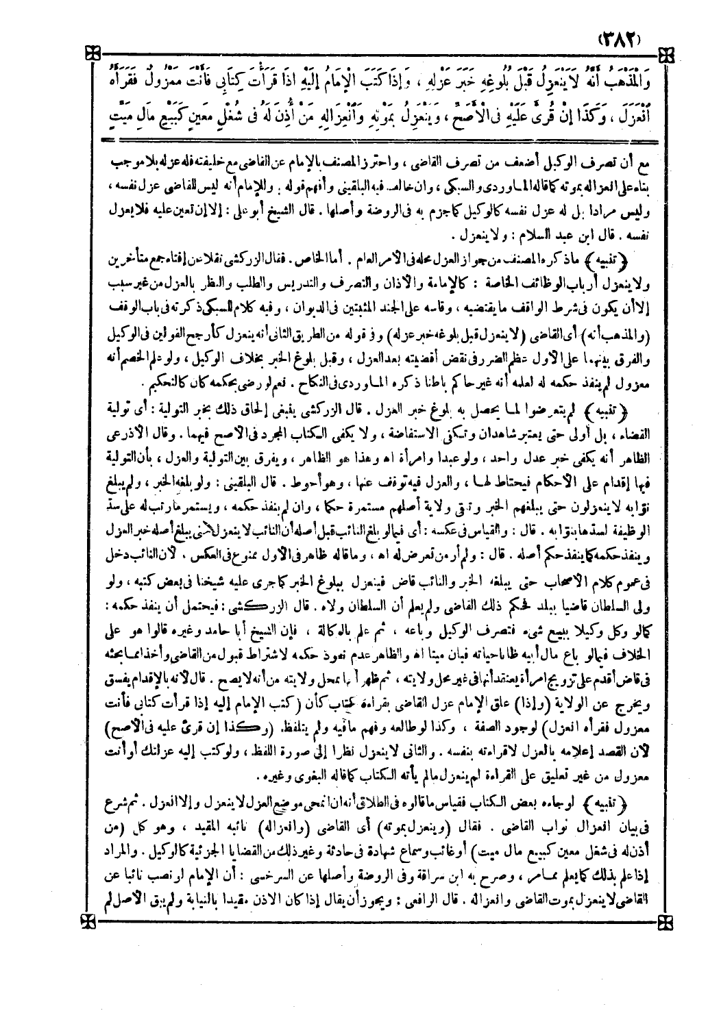 تنبيه لم يتعرضوا لما يحصل به بلوغ خبر العزل قال الزركشي ينبغي إلحاق ذلك بخبر التولية أي تولية القضاء بل أولى حتى يعتبر شاهدان وتكفي الاستفاضة ولا يكفي الكتاب المجرد في الأصح فيهما