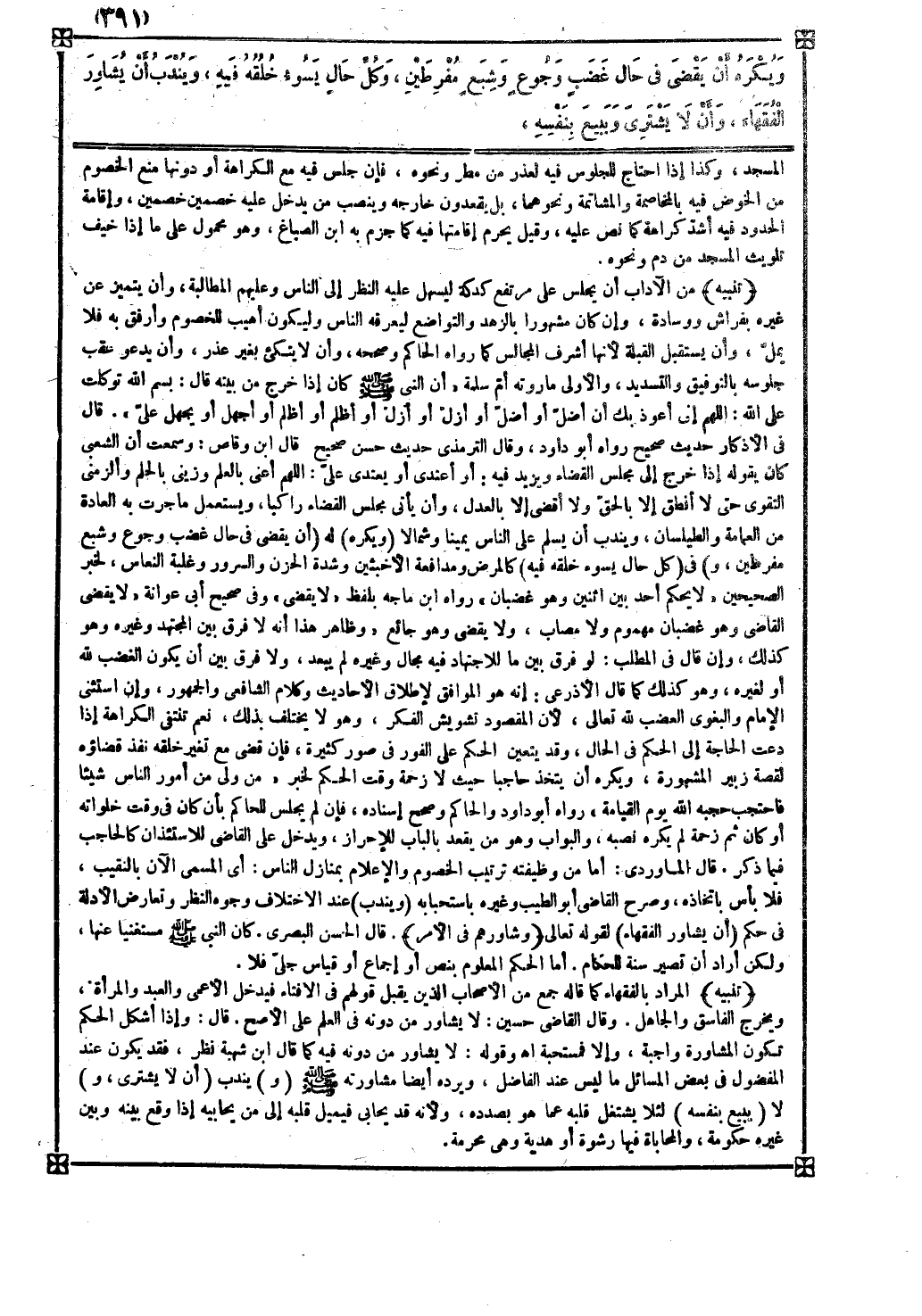 وكذا إذا احتاج للجلوس فيه لعذر من مطر ونحوه فإن جلس فيه مع الكراهة أو دونها منع الخصوم من الخوض فيه بالمخاصمة والمشاتمة ونحوهما بل يقعدون خارجه وينصب من يدخل عليه خصمين خصمين
