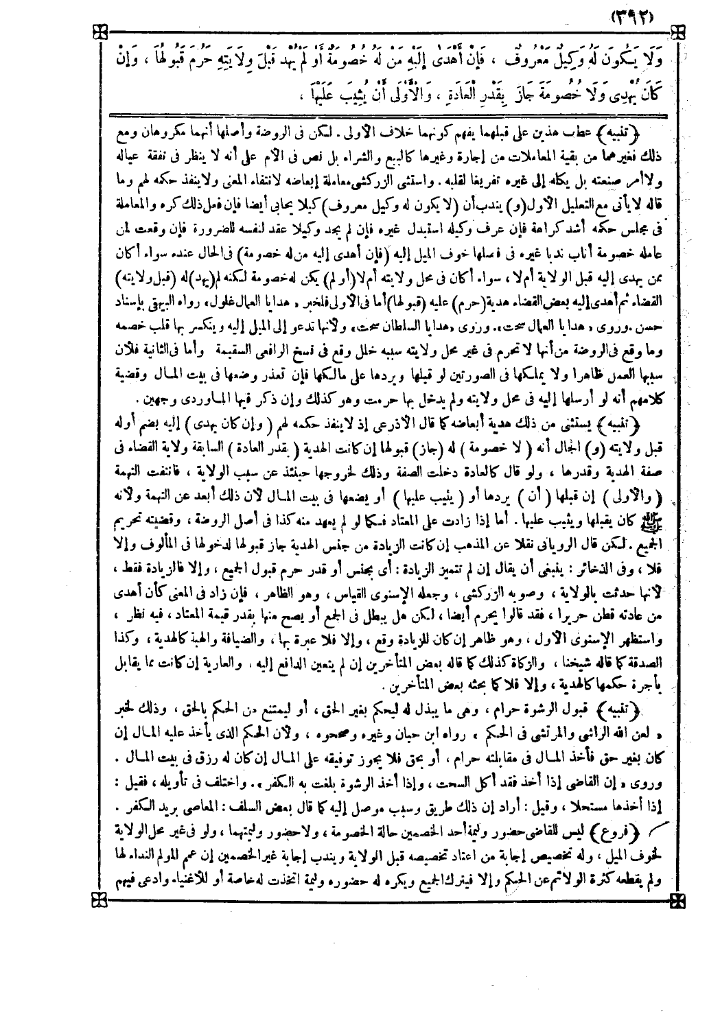 فروع ليس للقاضي حضور وليمة أحد الخصمين حالة الخصومة ولا حضور وليمتيهما ولو في غير محل الولاية لخوف الميل