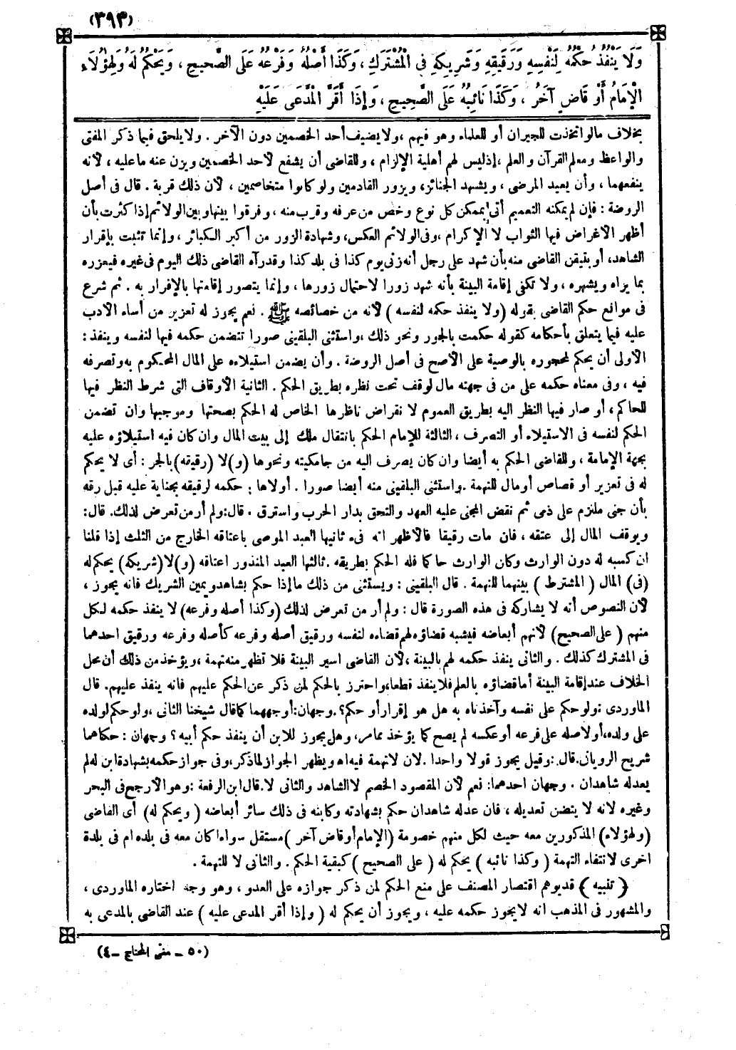 واستثنى البلقيني منه أيضا صورا أولاها حكمه لرقيقه بجناية عليه قبل رقه بأن جنى ملتزم على ذمي ثم نقض المجني عليه العهد والتحق بدار الحرب واسترق قال ولم أر من تعرض لذلك قال ويوقف المال إلى عتقه فإن مات رقيقا فالأظهر أنه فيء ثانيها العبد الموصى بإعتاقه الخارج من الثلث إذا قلنا إن كسبه له دون الوارث وكان الوارث حاكما فله الحكم بطريقه