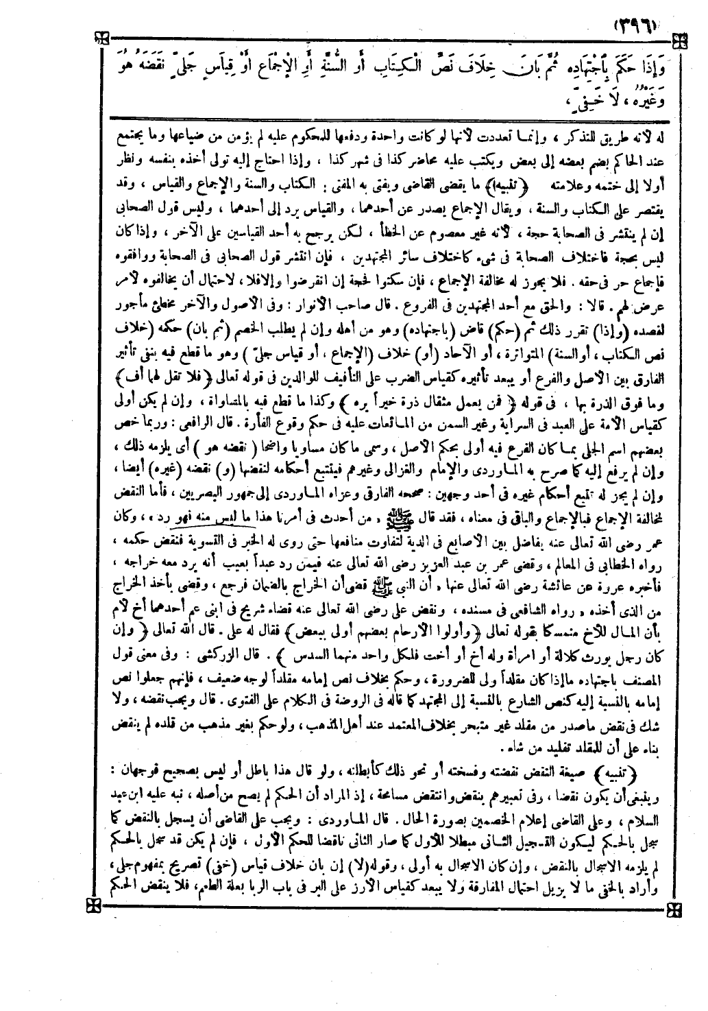 تنبيه ما يقضي به القاضي ويفتي به المفتي الكتاب والسنة والإجماع والقياس وقد يقتصر على الكتاب والسنة ويقال الإجماع يصدر عن أحدهما والقياس يرد إلى أحدهما