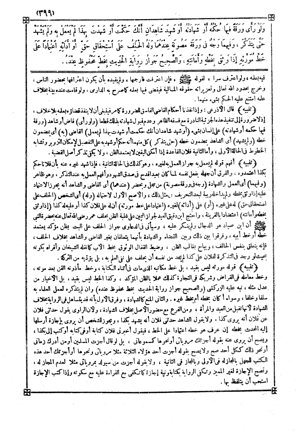 ويجوز للشخص أن يروي بإجازة أرسلها إليه المحدث بخطه إن عرف هو خطه اعتمادا على الخط فيقول أخبرني فلان كتابة أو في كتابة أو كتب إلي بكذا ويصح أن يروي عنه بقوله أجزتك مروياتي أو نحوها كمسموعاتي بل لو قال أجزت المسلمين أو من أدرك زماني أو نحو ذلك ككل أحد صح ولا يصح بقوله أجزت أحد هؤلاء الثلاثة مثلا مروياتي ونحوها أو أجزتك أحد هذه الكتب للجهل بالمجاز له في الأولى وبالمجاز في الثانية ولا بقوله أجزت من سيولد بمروياتي مثلا لعدم المجاز له