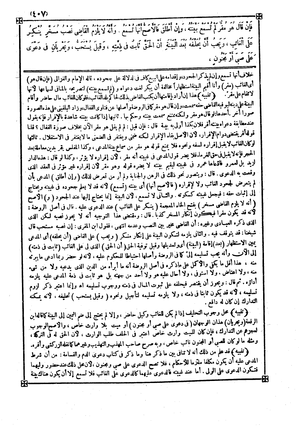 تنبيه قد علم من ذلك أنه لا تنافي بين ما ذكر هنا وما ذكر في كتاب دعوى الدم والقسامة من أن شرط المدعى عليه أن يكون مكلفا ملتزما للأحكام فلا تصح الدعوى على صبي ومجنون لأن محل ذلك عند حضور وليهما فتكون الدعوى على الولي أما عند غيبته فالدعوى عليهما كالدعوى على الغائب فلا تسمع إلا أن يكون هناك بينة