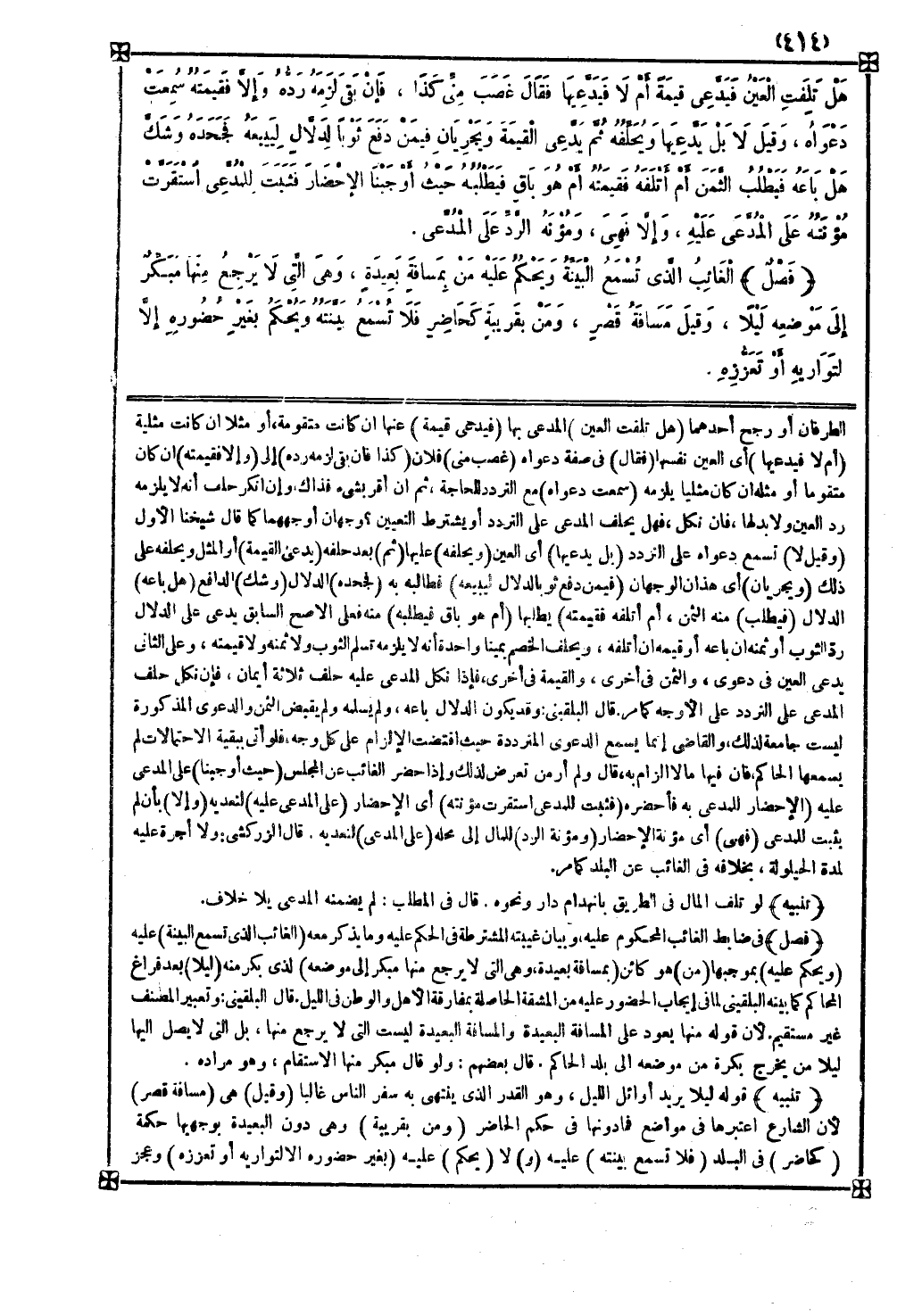 فصل في ضابط الغائب المحكوم عليه وبيان غيبته المشترطة في الحكم عليه وما يذكر معه ( الغائب الذي تسمع البينة ) عليه ( ويحكم عليه ) بموجبها ( من ) هو كائن ( بمسافة بعيدة وهي التي لا يرجع منها مبكر إلى موضعه ) لذي بكر منه ( ليلا ) بعد فراغ المحاكم كما بينه البلقيني لما في إيجاب الحضور عليه من المشقة الحاصلة بمفارقة الأهل والوطن في الليل