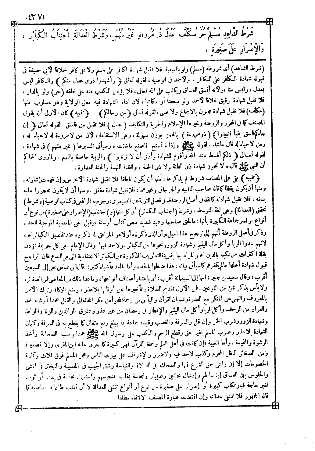 ( وشرط ) تحقق ( العدالة ) وهي لغة التوسط و شرعا ( اجتناب الكبائر ) أي كل منها ( و ) اجتناب ( الإصرار على صغيرة ) من نوع أو أنواع