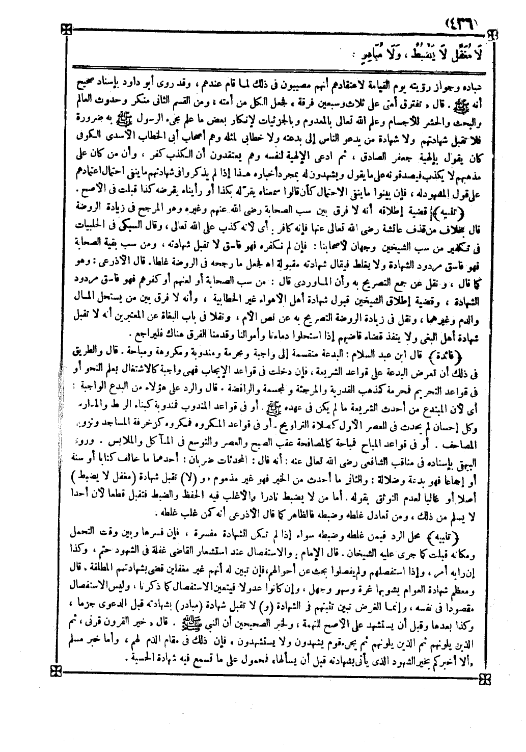 فائدة قال ابن عبد السلام البدعة منقسمة إلى واجبة ومحرمة ومندوبة ومكروهة ومباحة قال والطريق في ذلك أن تعرض البدعة على قواعد الشريعة فإن دخلت في قواعد الإيجاب فهي واجبة كالاشتغال بعلم النحو أو في قواعد التحريم فمحرمة كمذهب القدرية والمرجئة والمجسمة والرافضة