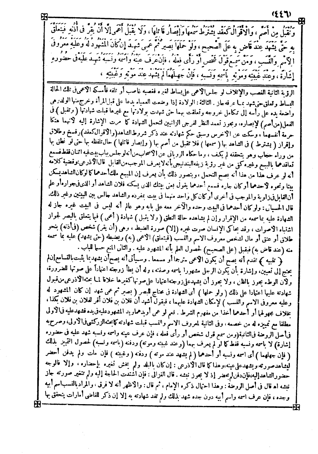 ( ولا يقبل ) شهادة ( أعمى ) فيما يتعلق بالبصر لجواز اشتباه الأصوات وقد يحاكي الإنسان صوت غيره ( إلا ) صورة الضبط وهي ( أن يقر ) شخص ( في أذنه ) بنحو طلاق أو عتق أو مال لشخص معروف الاسم والنسب ( فيتعلق ) الأعمى ( به ) ويضبطه ( حتى يشهد ) عليه بما سمعه منه ( عند قاض به ) فيقبل ( على الصحيح ) لحصول العلم بأنه المشهود عليه