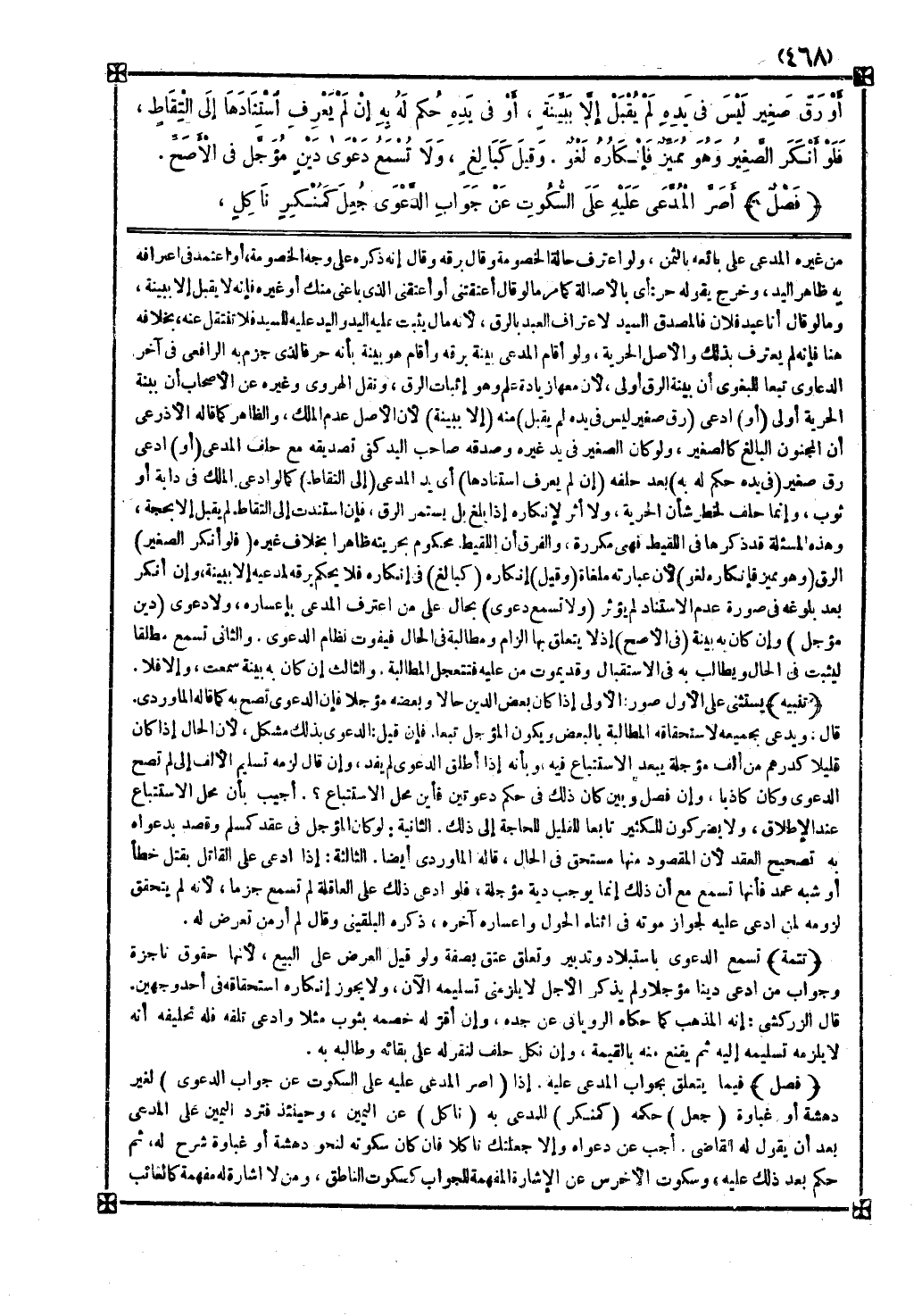 فصل فيما يتعلق بجواب المدعى عليه إذا ( أصر المدعى عليه على السكوت عن جواب الدعوى ) لغير دهشة أو غباوة ( جعل ) حكمه ( كمنكر ) للمدعي به ( ناكل ) عن اليمين وحينئذ فترد اليمين على المدعي بعد أن يقول له القاضي أجب عن دعواه وإلا جعلتك ناكلا