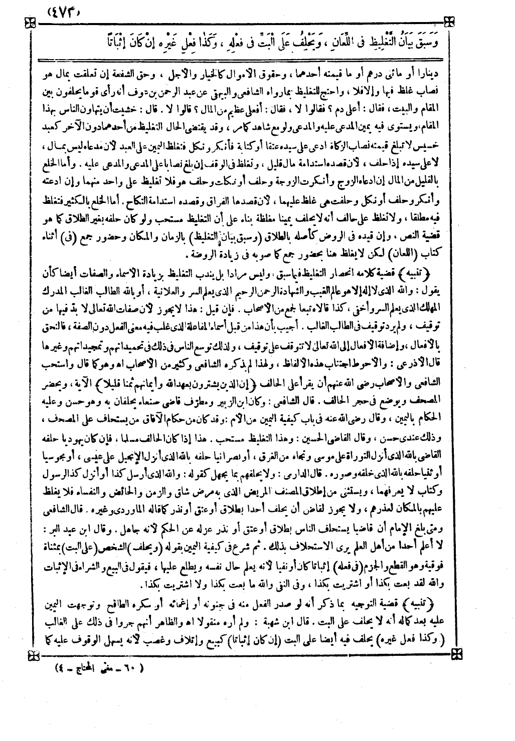 ويستوى فيه يمين المدعى عليه والمدعي ولو مع شاهد كما مر وقد يقتضي الحال التغليظ من أحدهما دون الآخر كعبد خسيس لا تبلغ قيمته نصاب الزكاة ادعى على سيده عتقا أو كتابة فأنكر ونكل فتغلظ اليمين على العبد لأن مدعاه ليس بمال لا على سيده إذا حلف لأن قصده استدامة مال قليل وتغلظ في الوقف إن بلغ نصابا على المدعي والمدعى عليه