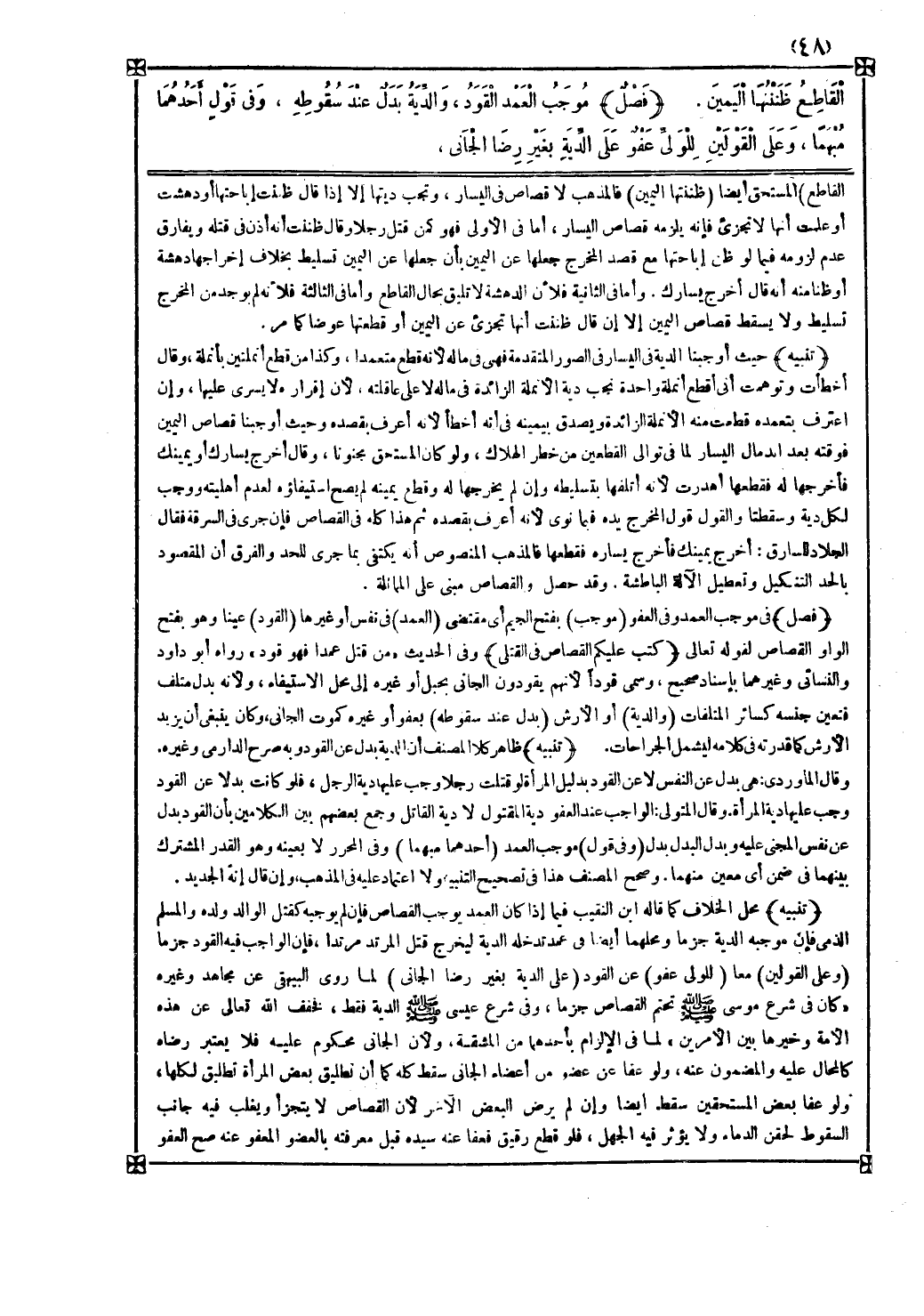 القاطع ) المستحق أيضا ( ظننتها اليمين ) فالمذهب لا قصاص في اليسار وتجب ديتها إلا إذا قال ظننت إباحتها أو دهشت أو علمت أنها لا تجزىء فإنه يلزمه قصاص اليسار