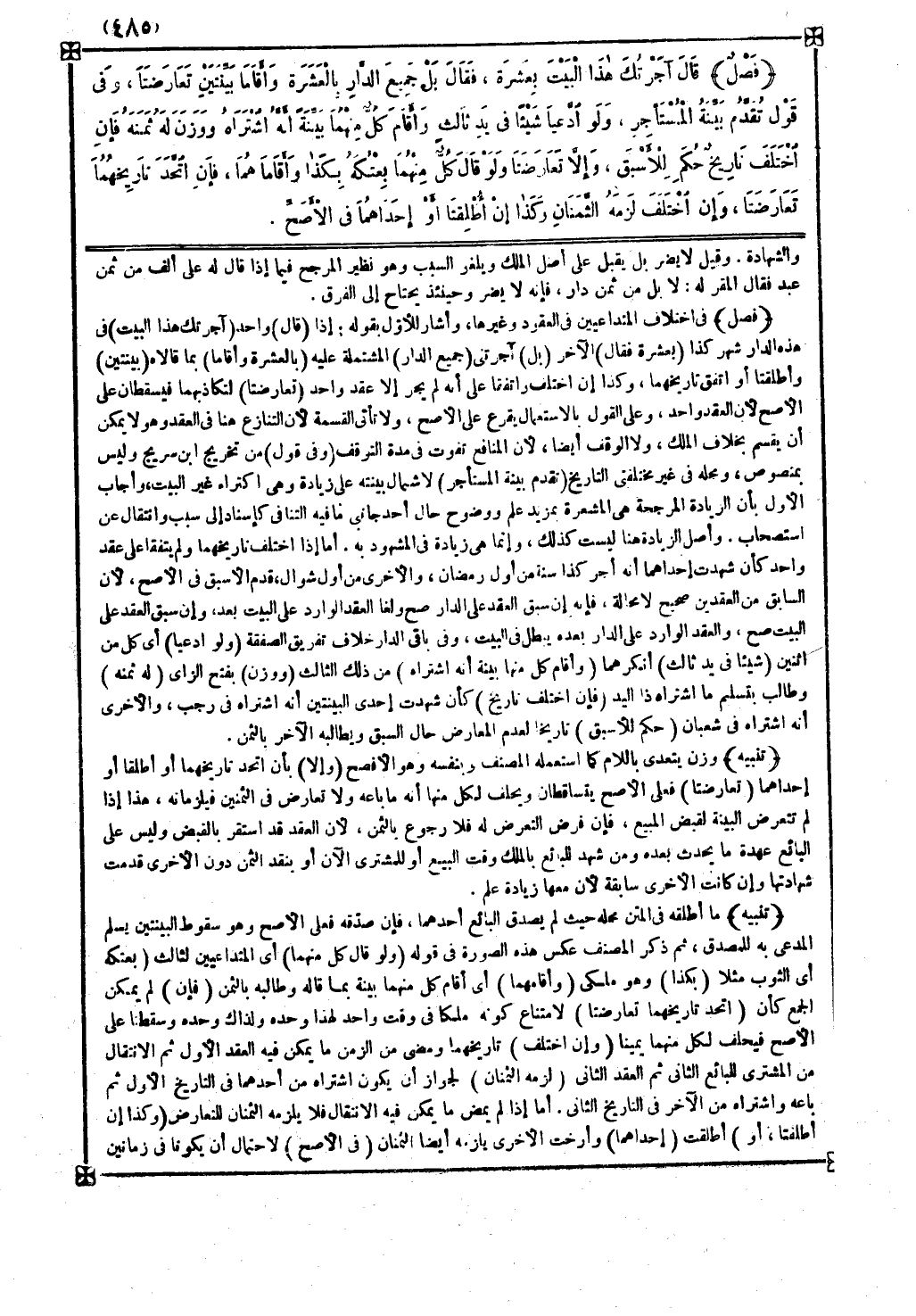 فصل في اختلاف المتداعيين في العقود وغيرها وأشار للأول بقوله إذا ( قال ) واحد ( آجرتك هذا البيت ) في هذه الدار شهر كذا ( بعشرة فقال ) الآخر ( بل ) آجرتني ( جميع الدار ) المشتملة عليه ( بالعشرة وأقاما ) بما قالاه ( بينتين ) وأطلقتا أو اتفق تاريخهما وكذا إن اختلف واتفقا على أنه لم يجر إلا عقد واحد ( تعارضتا ) لتكاذبهما فيسقطان على الأصح لأن العقد واحد وعلى القول بالاستعمال يقرع على الأصح ولا تأتي القسمة لأن التنازع هنا في العقد وهو لا يمكن أن يقسم بخلاف الملك ولا الوقف أيضا لأن المنافع تفوت في مدة التوقف