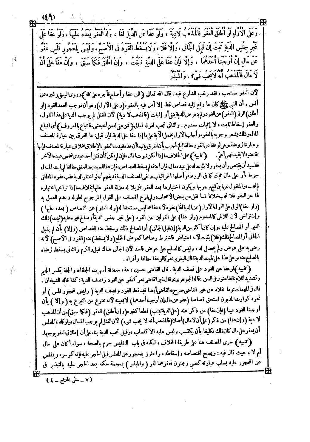 ( وليس لمحجور فلس ) أو نحوه كوارث المديون استحق قصاصا ( عفو عن مال إن أوجبنا أحدهما ) لا بعينه لأنه ممنوع من التبرع به ( وإلا ) بأن أوجبنا القود عينا ( فإن عفا ) من ذكر عنه ( على الدية ثبتت ) قطعا كغيره ( وإن أطلق ) العفو ( فكما سبق ) من أن المذهب لا دية ( وإن عفا ) من ذكر ( على أن لا مال ) أصلا ( فالمذهب أنه لا يجب شيء ) لأن القتل لم يوجب المال ولو كلفنا المفلس أن يعفو على مال كان ذلك تكليفا بأن يكتسب وليس عليه الاكتساب وقيل تجب الدية بناء على أن إطلاق العفو يوجبها