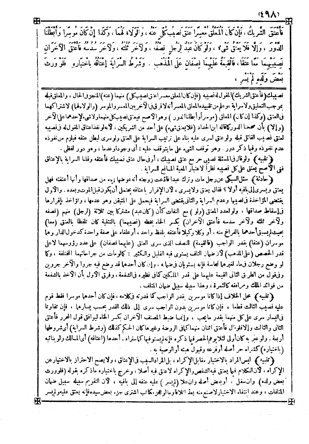 تنبيه ليس المراد بالاختيار مقابل الإكراه بل المراد السبب في الإعتاق ولا يصح الاحتراز بالاختيار عن الإكراه لأن الكلام فيما يعتق فيه الشقص والإكراه لا عتق فيه أصلا