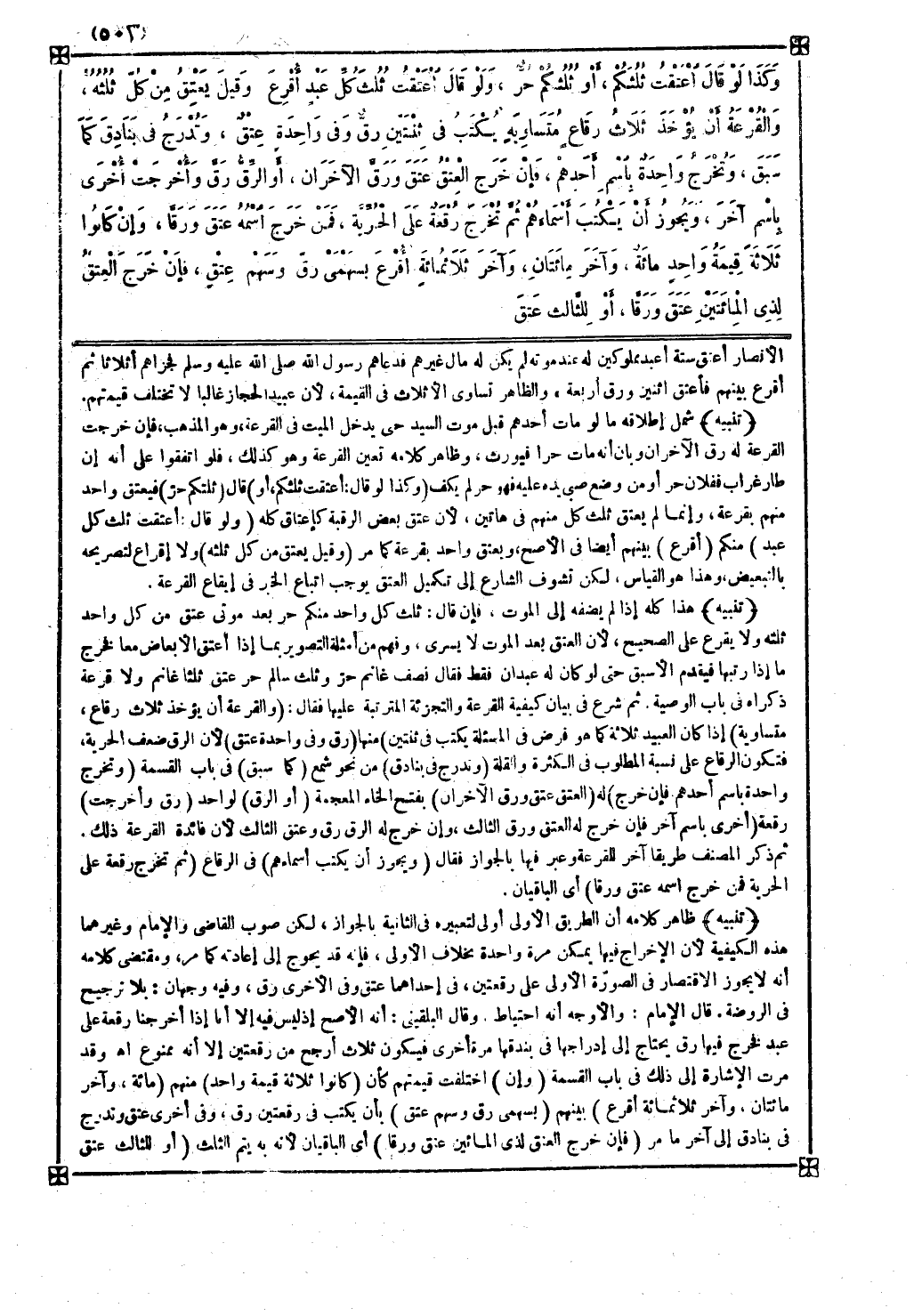 الأنصار أعتق ستة أعبد مملوكين له عند موته لم يكن له مال غيرهم فدعاهم رسول الله صلى الله عليه وسلم فجزاهم أثلاثا ثم أقرع بينهم فأعتق اثنين ورق أربعة والظاهر تساوي الأثلاث في القيمة لأن عبيد الحجاز غالبا لا تختلف قيمتهم