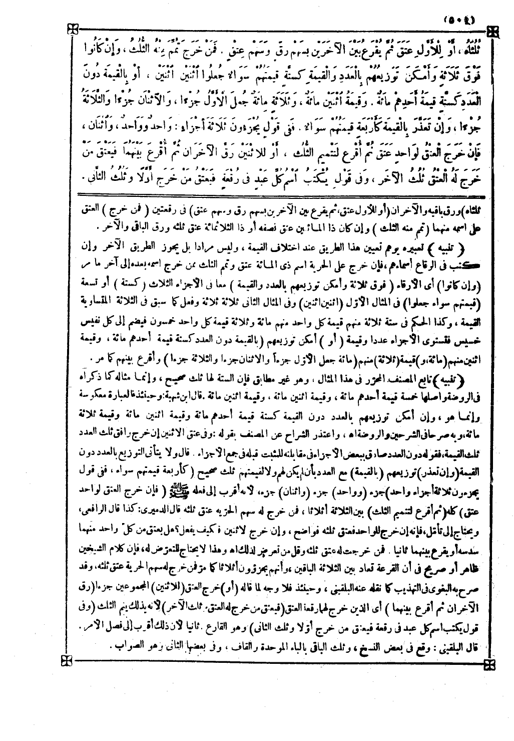 تنبيه تعبيره يوهم تعيين هذا الطريق عند اختلاف القيمة وليس مرادا بل يجوز الطريق الآخر وإن كتب في الرقاع أسماءهم فإن خرج على الحرية اسم ذي المائة عتق وتمم الثلث ممن خرج اسمه بعده إلى آخر ما مر