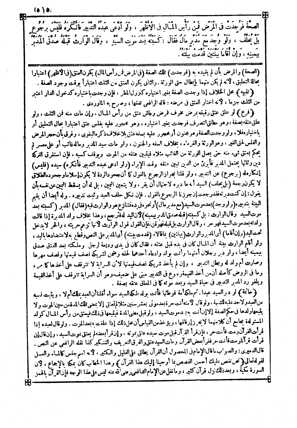 (ولو وجد) بعد موت السيد (مع مدبر مال) أو نحوه في يده فتنازع هو والوارث فيه (فقال) المدبر (كسبته بعد موت السيد وقال الوارث) بل كسبته (قبله صدق المدبر بيمينه) لأن اليد له فترجح وهذا بخلاف ولد المدبرة إذا قالت ولدته بعد موت السيد فهو حر وقال الوارث بل قبله فهو قن فإن القول قول الوارث لأنها تزعم حريته والحر لا يدخل تحت اليد