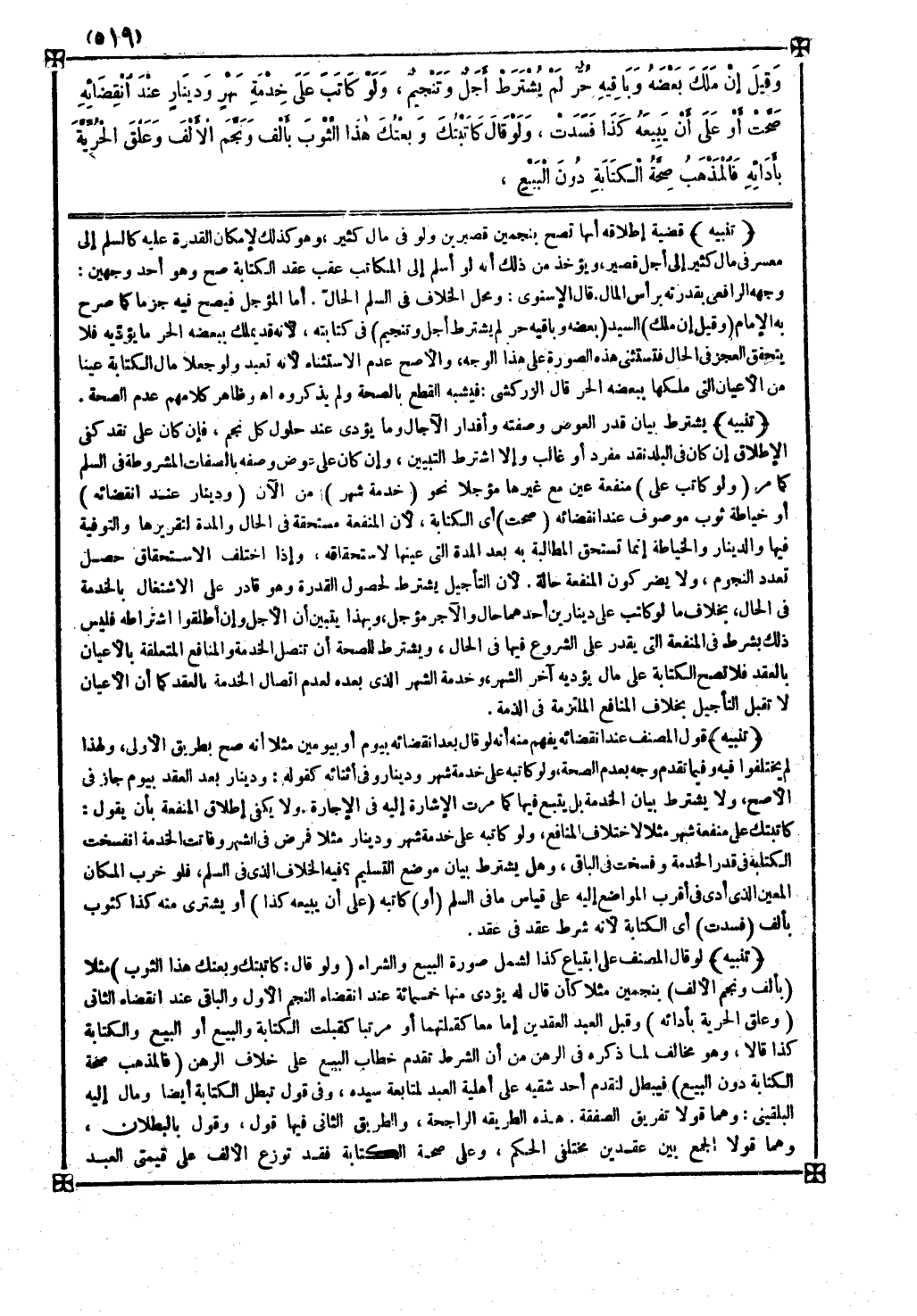 ويشترط للصحة أن تتصل الخدمة والمنافع المتعلقة بالأعيان بالعقد فلا تصح الكتابة على مال يؤديه آخر الشهر وخدمة الشهر الذي بعده لعدم اتصال الخدمة بالعقد كما أن الأعيان لا تقبل التأجيل بخلاف المنافع الملتزمة في الذمة