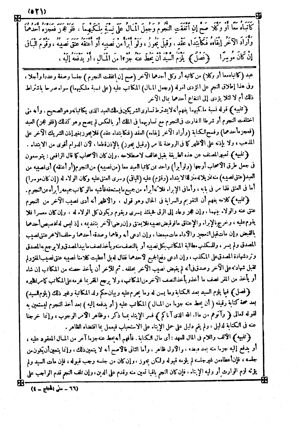 تنبيه قوله نسبة ملكيهما يفهم أنه لا يشترط تساوي الشريكين في ملك العبد الذي يكاتبانه وهو الصحيح وأنه متى اختلفت النجوم أو شرطا التفاوت في النجوم مع تساويها في الملك أو بالعكس لم يصح وهو كذلك