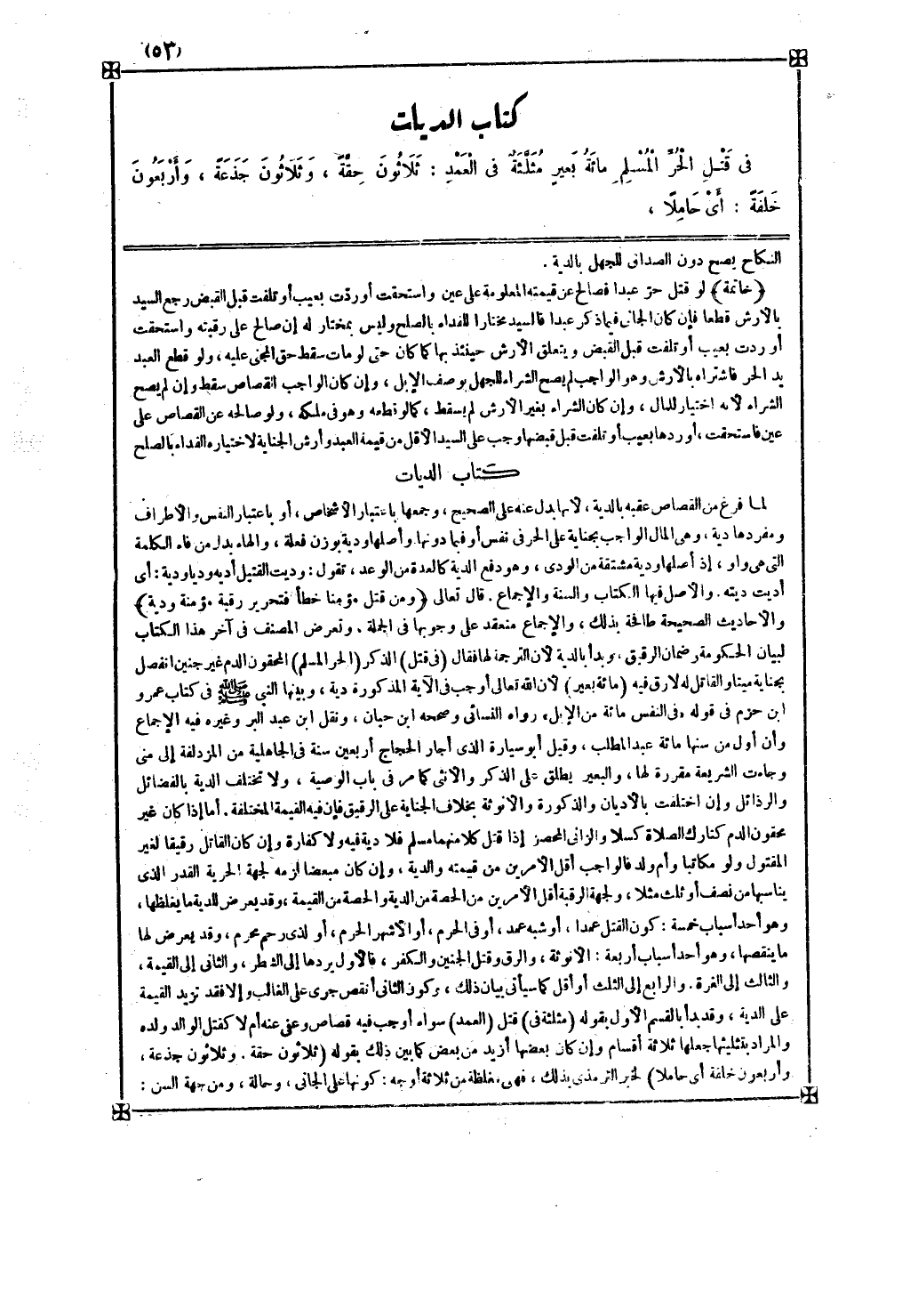 وتعرض المصنف في آخر هذا الكتاب لبيان الحكومة وضمان الرقيق وبدأ بالدية لأن الترجمة لها فقال (في قتل) الذكر (الحر المسلم) المحقون الدم غير جنين انفصل بجناية ميتا والقاتل له لا رق فيه (مائة بعير) لأن الله تعالى أوجب في الآية المذكورة دية وبينها النبي صلى الله عليه وسلم في كتاب عمرو بن حزم في قوله في النفس مائة من الإبل رواه النسائي وصححه ابن حبان ونقل ابن عبد البر وغيره فيه الإجماع وأن أول من سنها مائة عبد المطلب وقيل أبو سيارة الذي أجار الحجاج أربعين سنة في الجاهلية من المزدلفة إلى منى وجاءت الشريعة مقررة لها