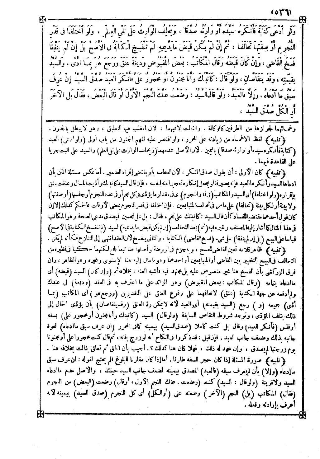 ( ولو قال ) السيد ( كاتبتك وأنا مجنون أو محجور علي ) بسفه أو فلس ( فأنكر العبد ) وقال بل كنت كاملا ( صدق السيد ) بيمينه كما في المحرر ( إن عرف سبق ما ادعاه ) لقوة جانبه بذلك وضعف جانب العبد