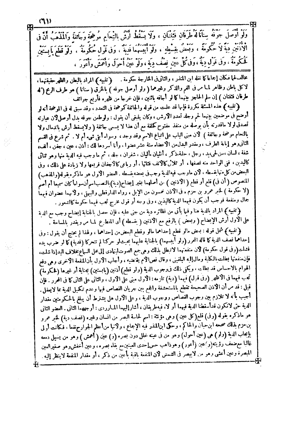ثم شرع في القسم الثاني وهو إبانة الطرف ومقدر البدل من الأعضاء ستة عشر عضوا وأنا أسردها لك أذن عين جفن أنف شفة لسان سن لحي يد رجل حلمة ذكر أنثيان أليان شفران جلد ثم ما وجب فيه الدية منها وهو ثنائي كاليدين ففي الواحد منه نصفها أو ثلاثي كالأنف فثلثها أو رباعي كالأجفان فربعها ولا زيادة على ذلك وفي البعض من كل منها بقسطه لأن ما وجب فيه الدية وجب في بعضه بقسطه